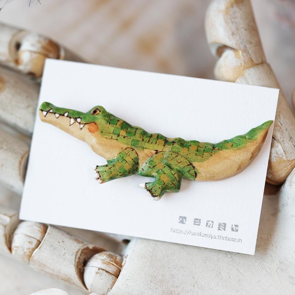 A wooden brooch with a warm, natural feel, featuring a cute crocodile design.