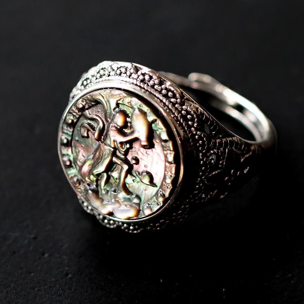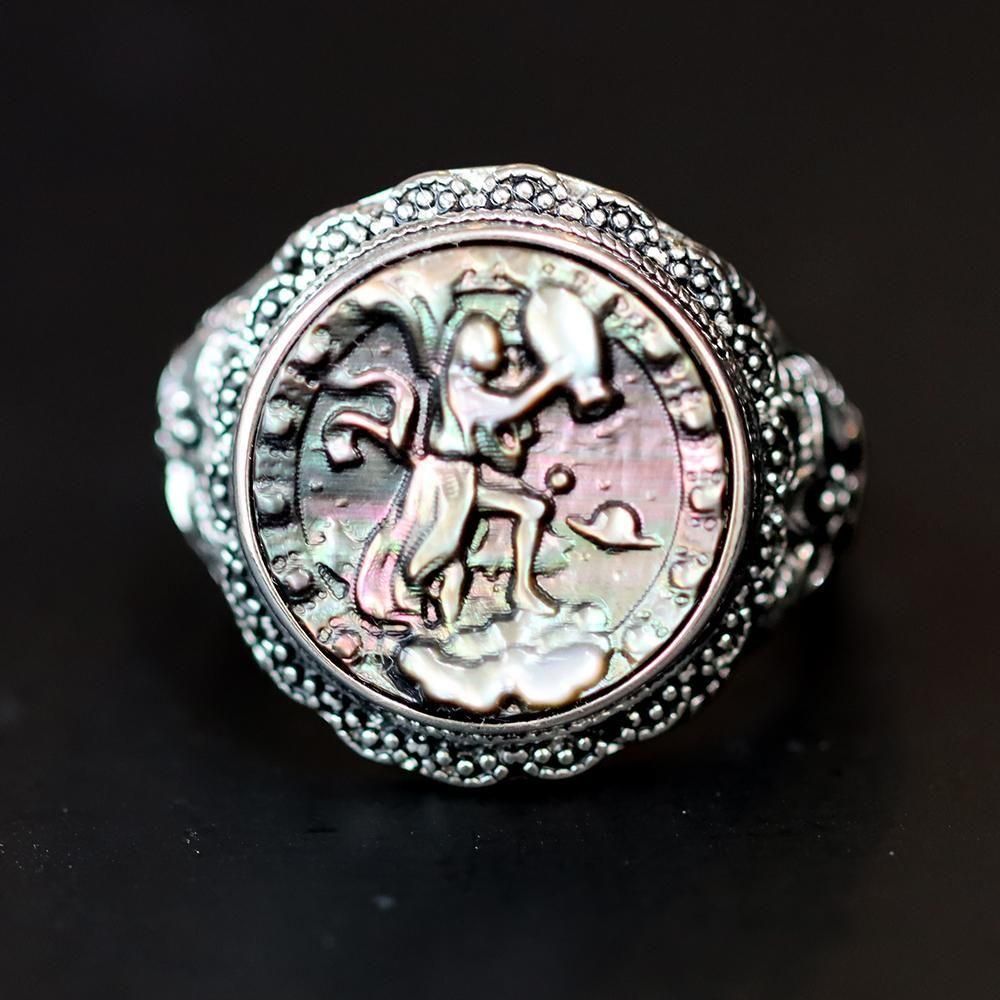 水瓶座のシンボルが彫刻された黒蝶貝の指輪です。