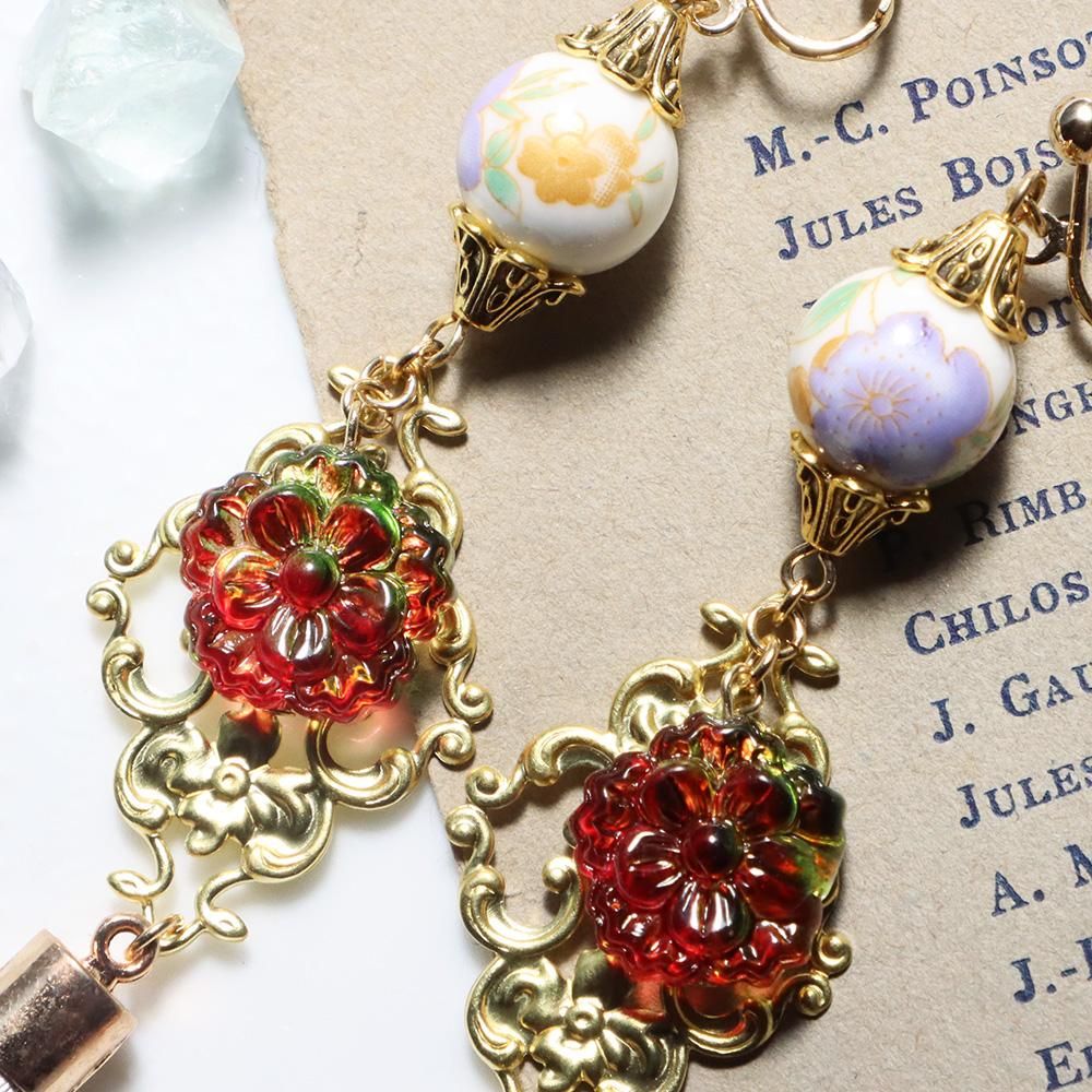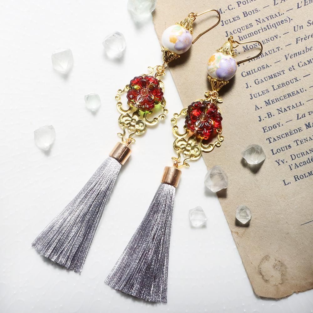 シノワズリ柄ビーズのかわいいタッセルピアスです。