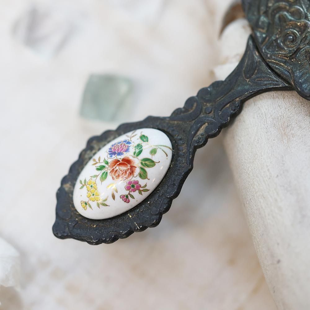 ハンドル部分には、小さな花々が描かれた陶製プレートがはめ込まれており、