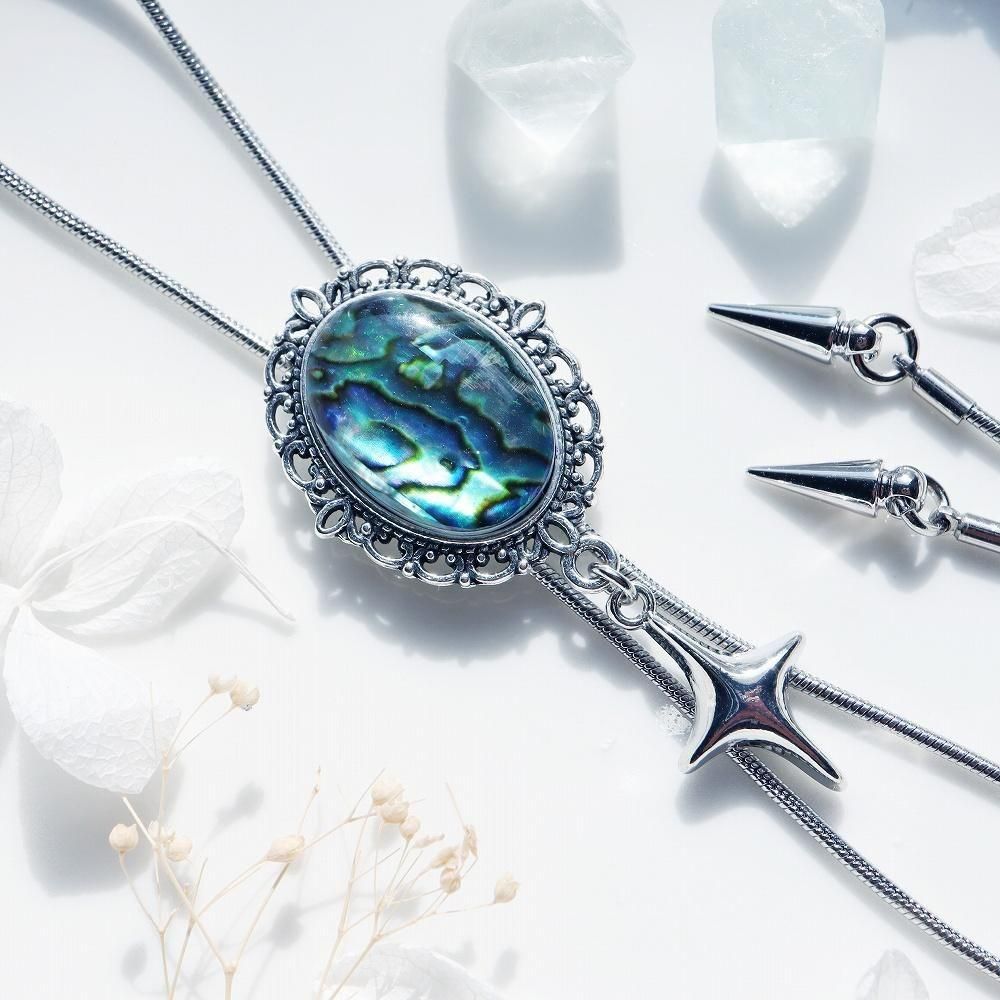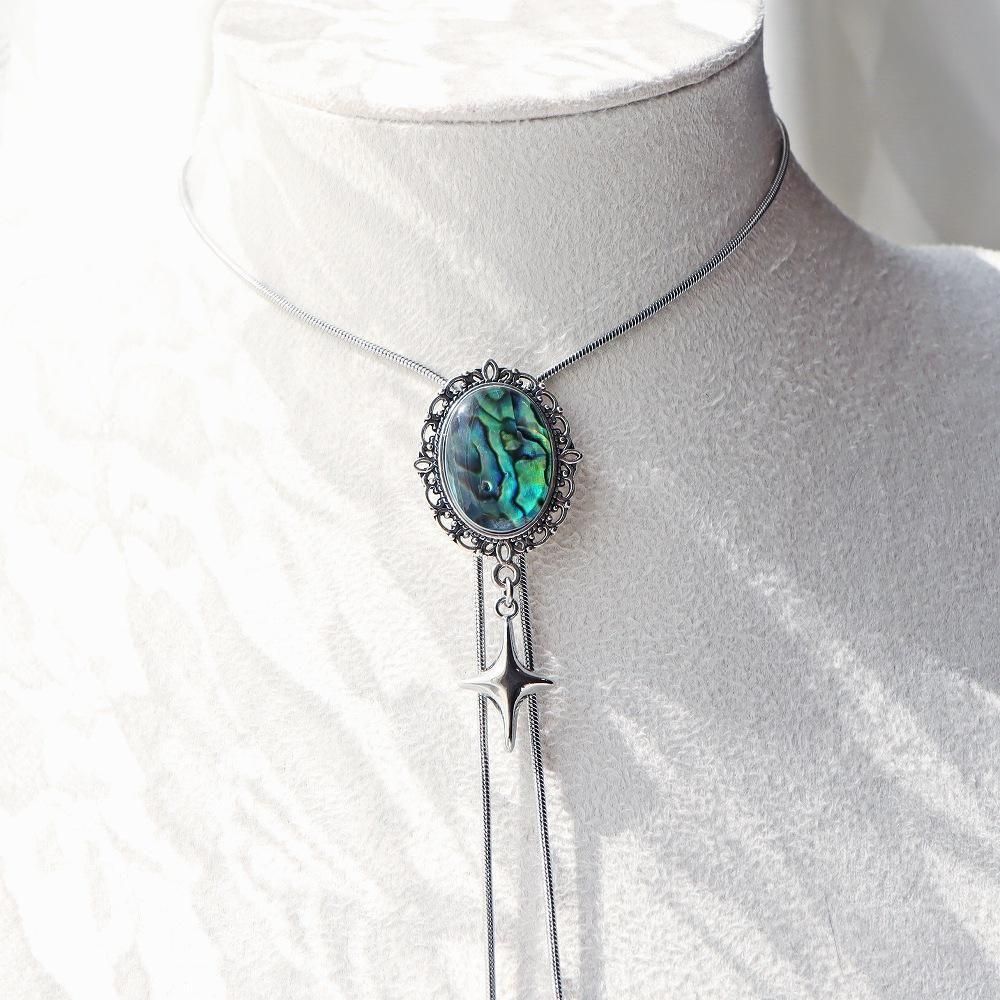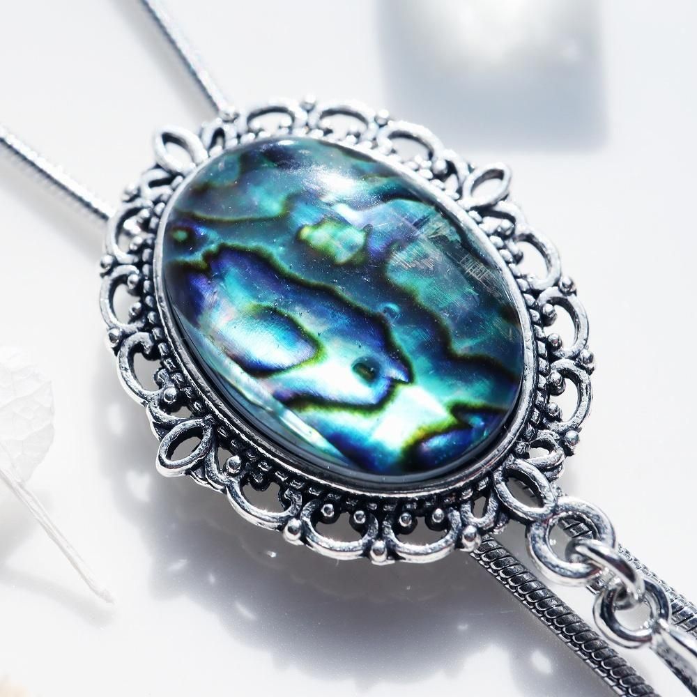 虹色に輝くアヴァロンシェルを使用したチェーンループタイです。