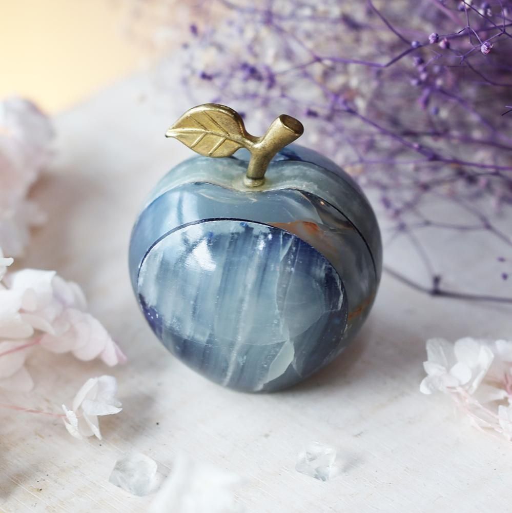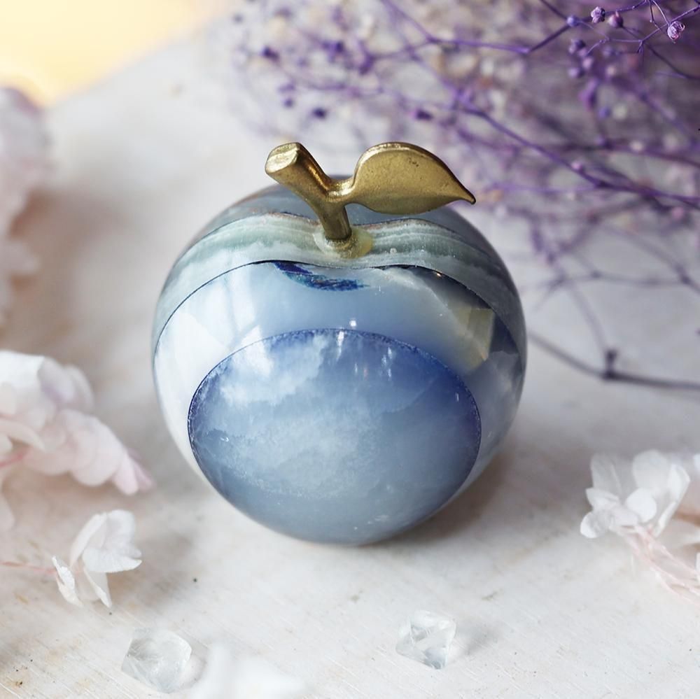 ブラジル産メノウが貼り合わされて出来た青いリンゴのオブジェです。
