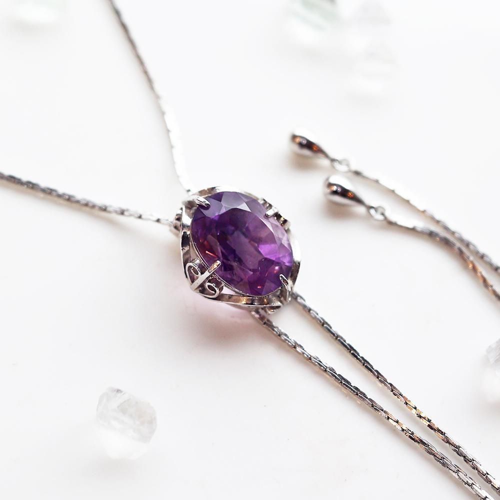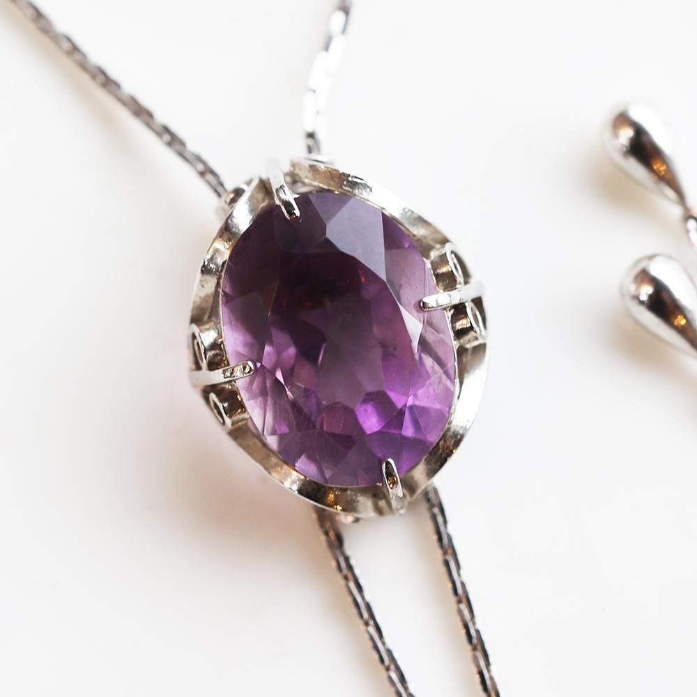 A chain bolo tie featuring a transparent amethyst with beautiful clarity.