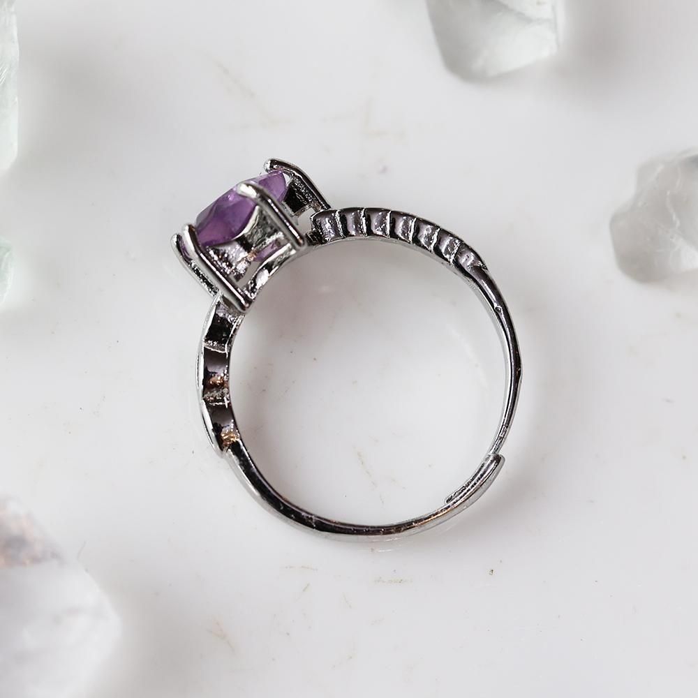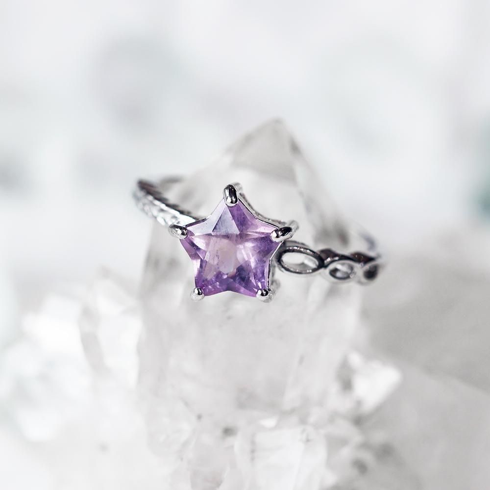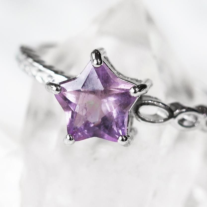 薄い紫色の星型アメジストがあしらわれた、素敵なデザインの指輪です。