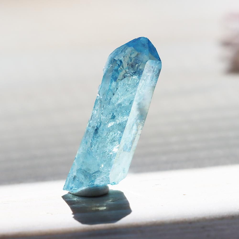 A beautiful blue-rainbow Aqua Aura crystal from Arkansas, USA.