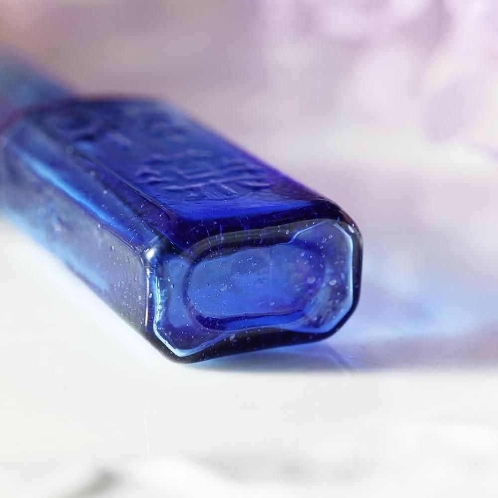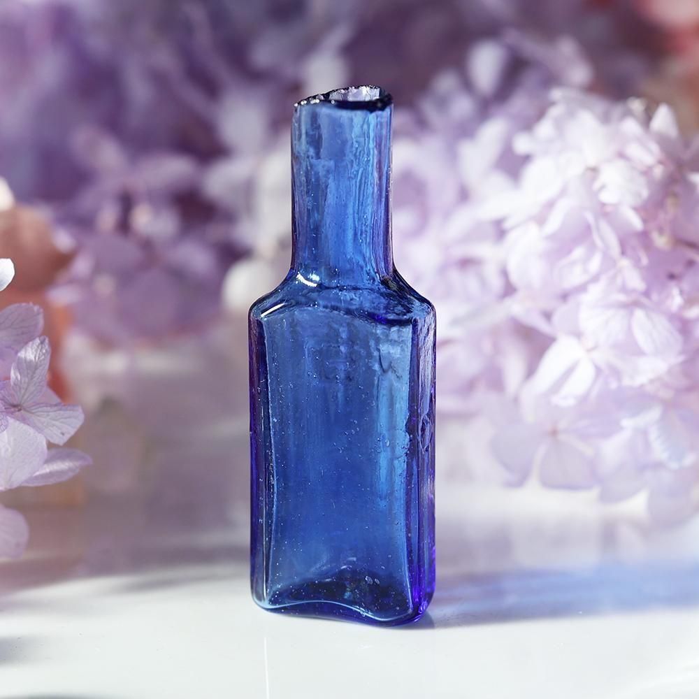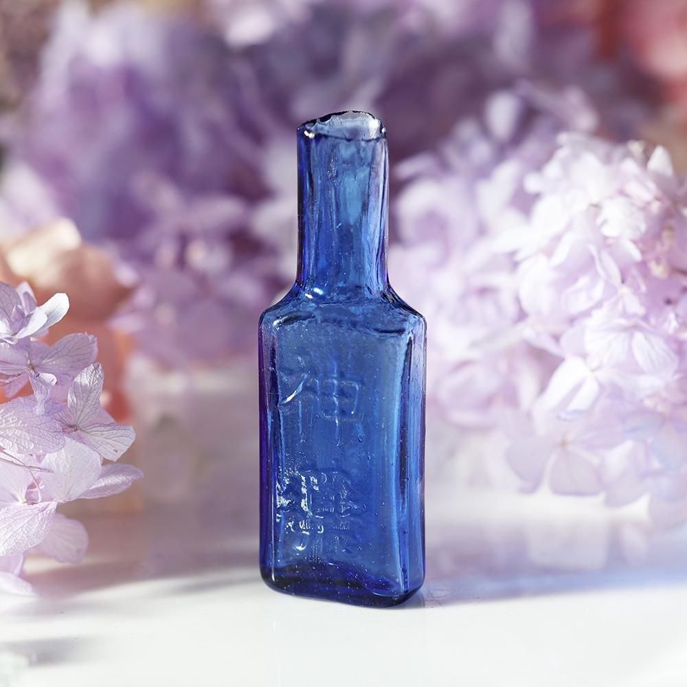 An old Japanese medicine bottle from early Showa period, featuring charming bubbles and natural distortions in the glass.