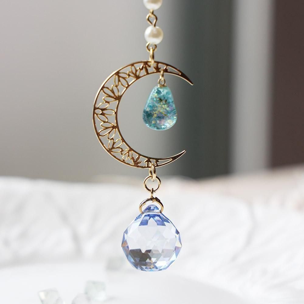 A sun catcher featuring sea glass, a crescent moon, and sparkling glass stones.