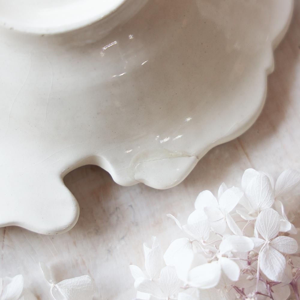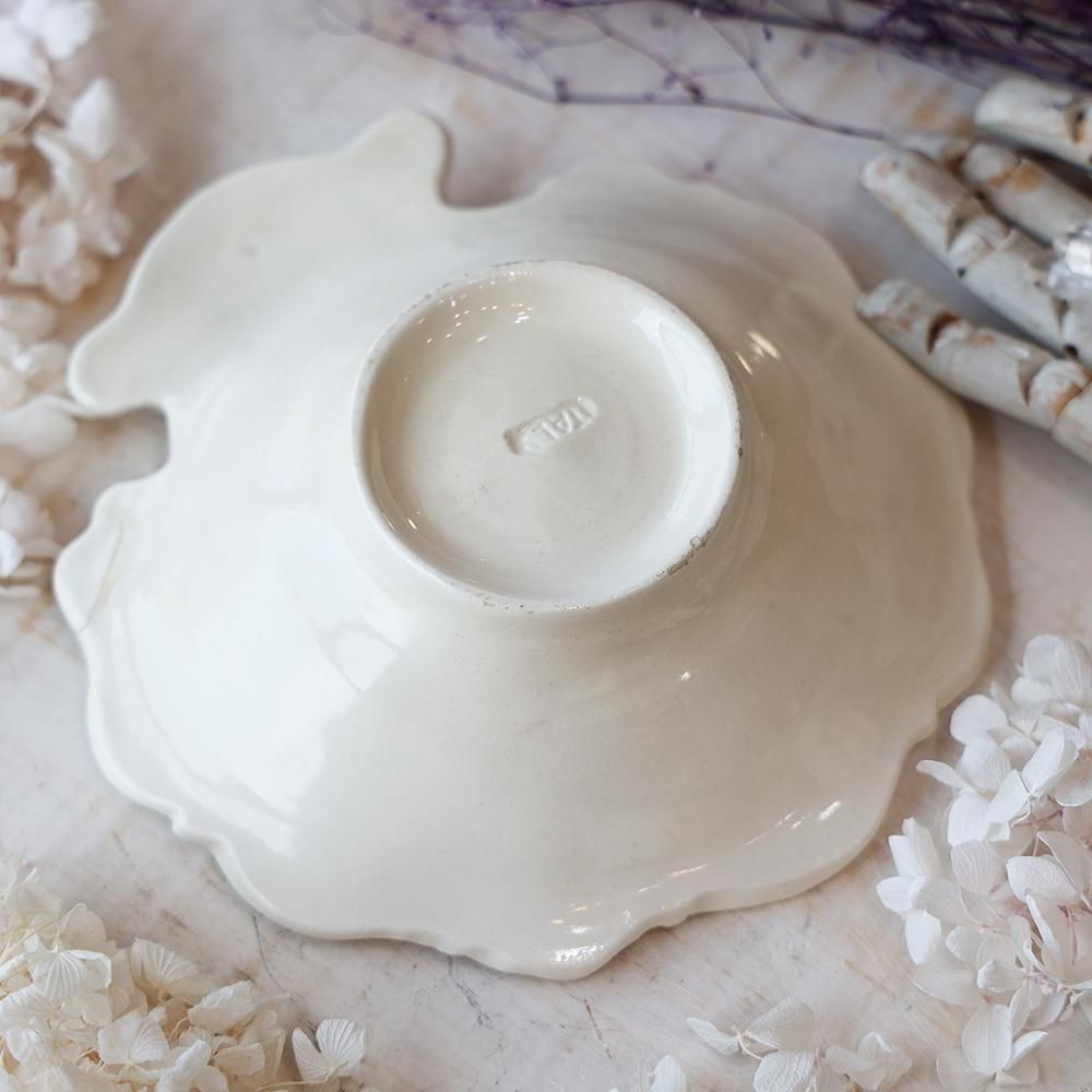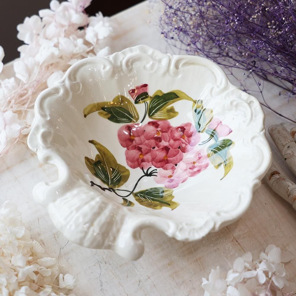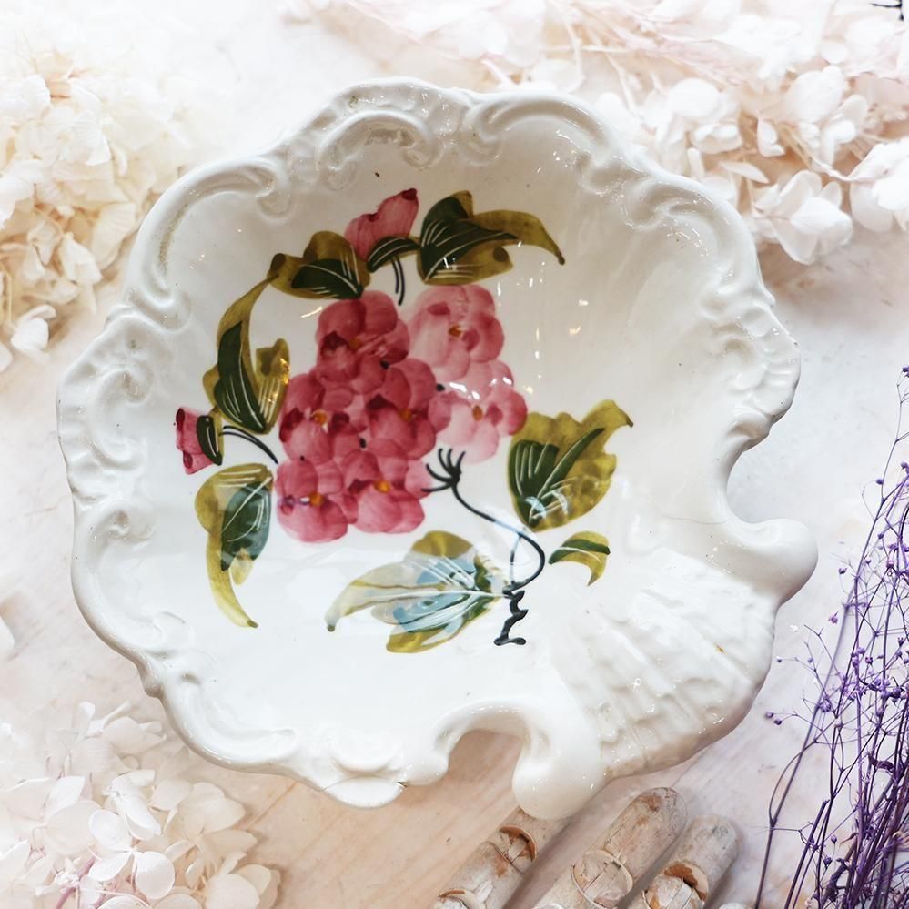 シェルの形がかわいい、レトロな花柄の陶トレイです。