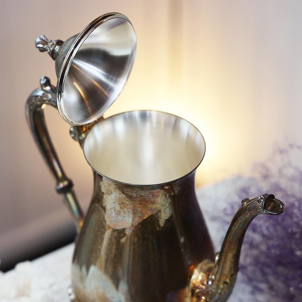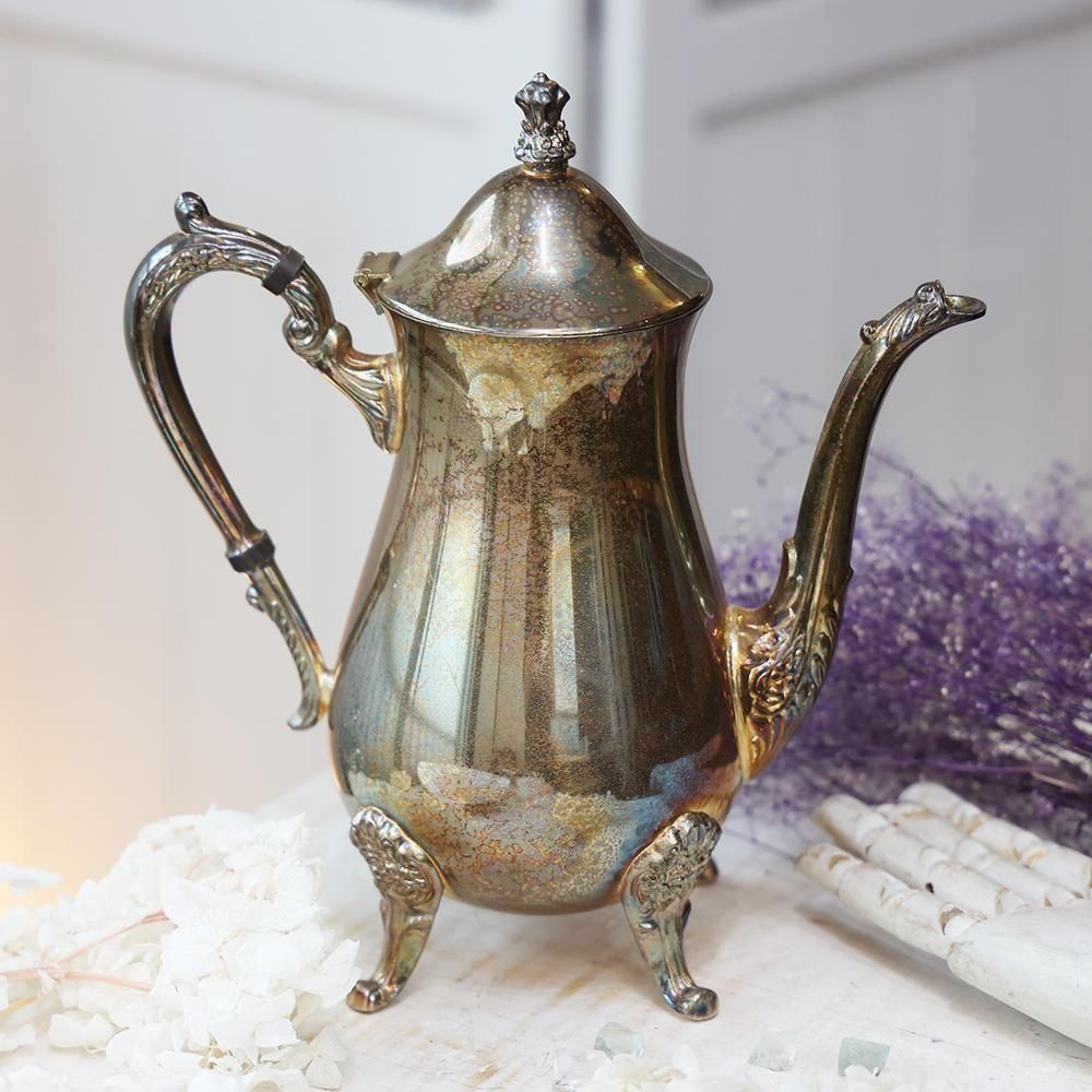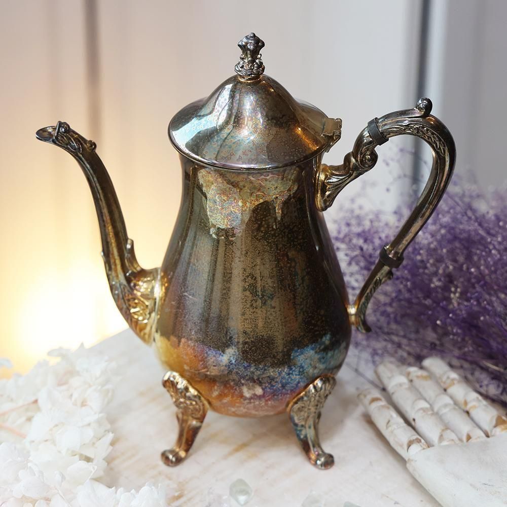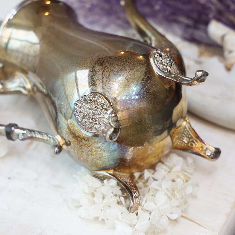 アンティーク感のある、古びた銀鍍金のティーポットです。