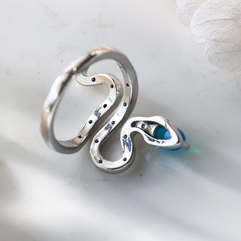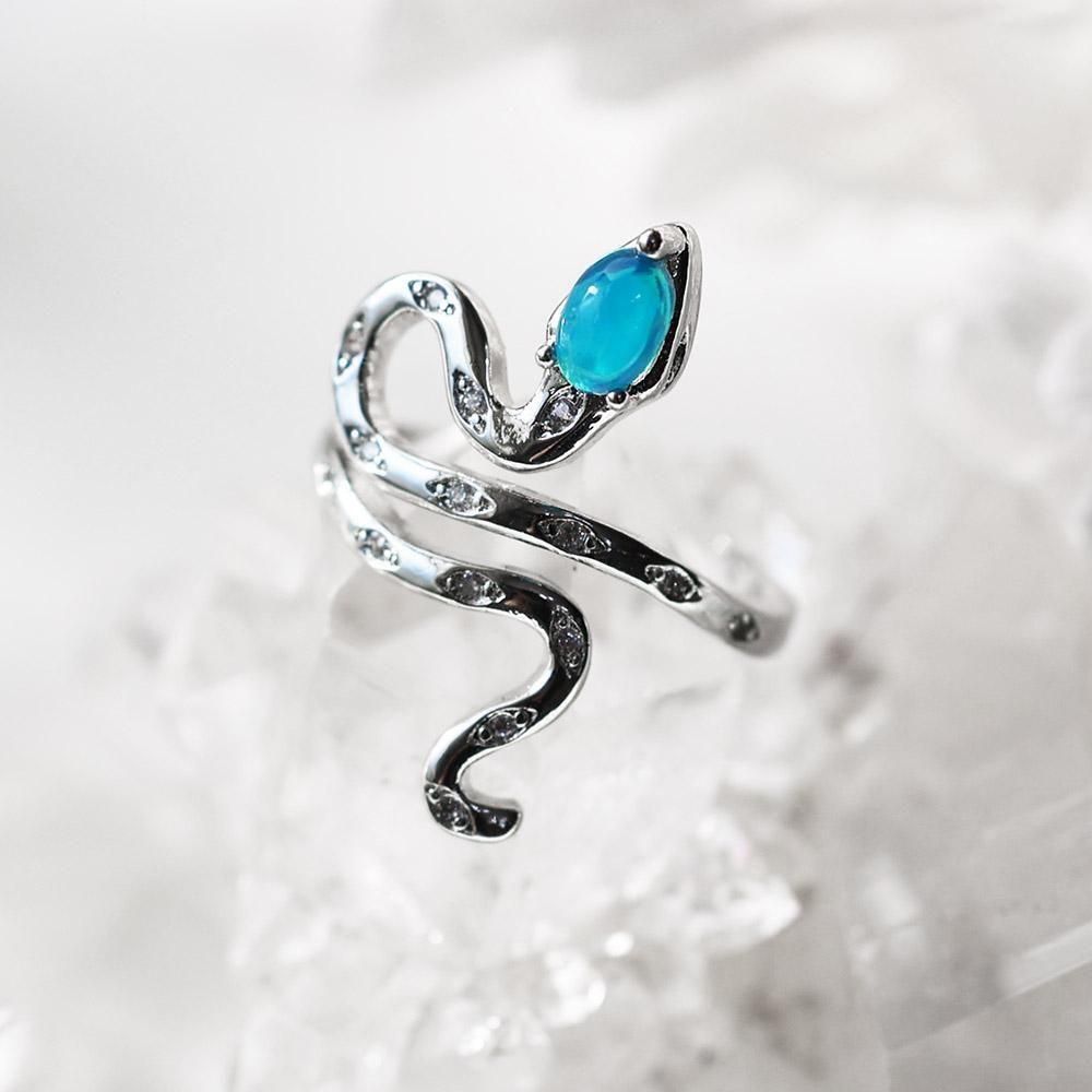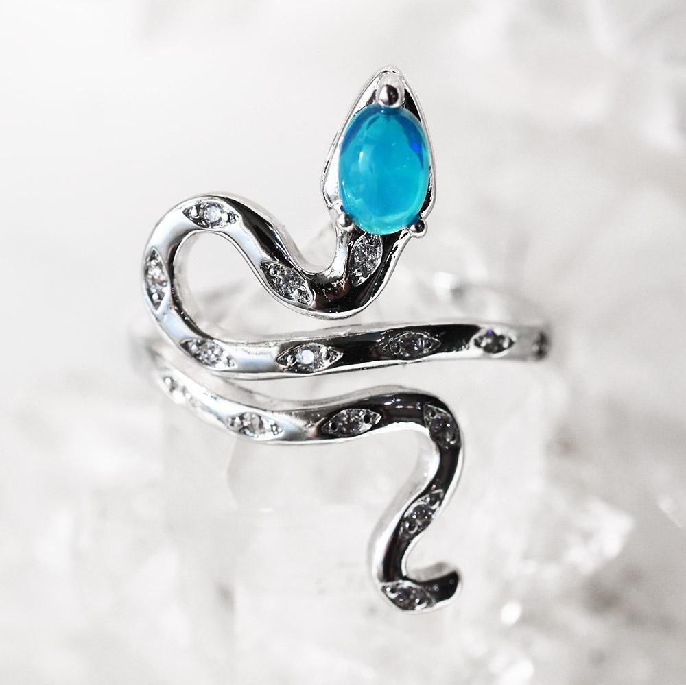 綺麗なブルーのオパールを頭に載せた蛇の指輪です。