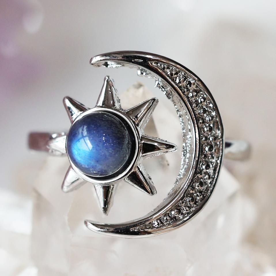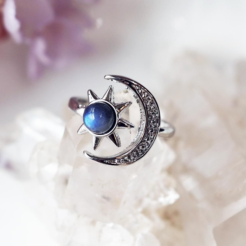 A beautiful ring featuring a labradorite with a striking blue rainbow sheen, set in a sun and moon design.
