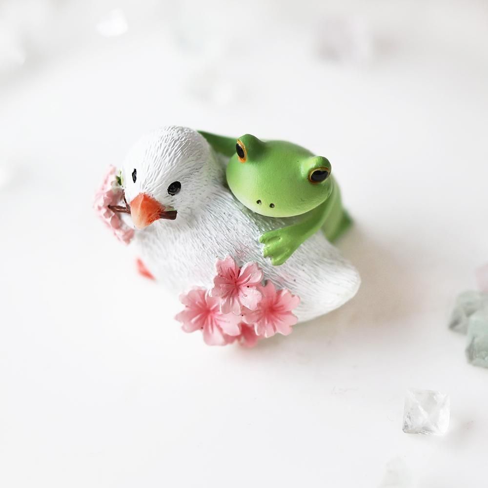文鳥に寄り添うカエルの樹脂製オブジェです。
