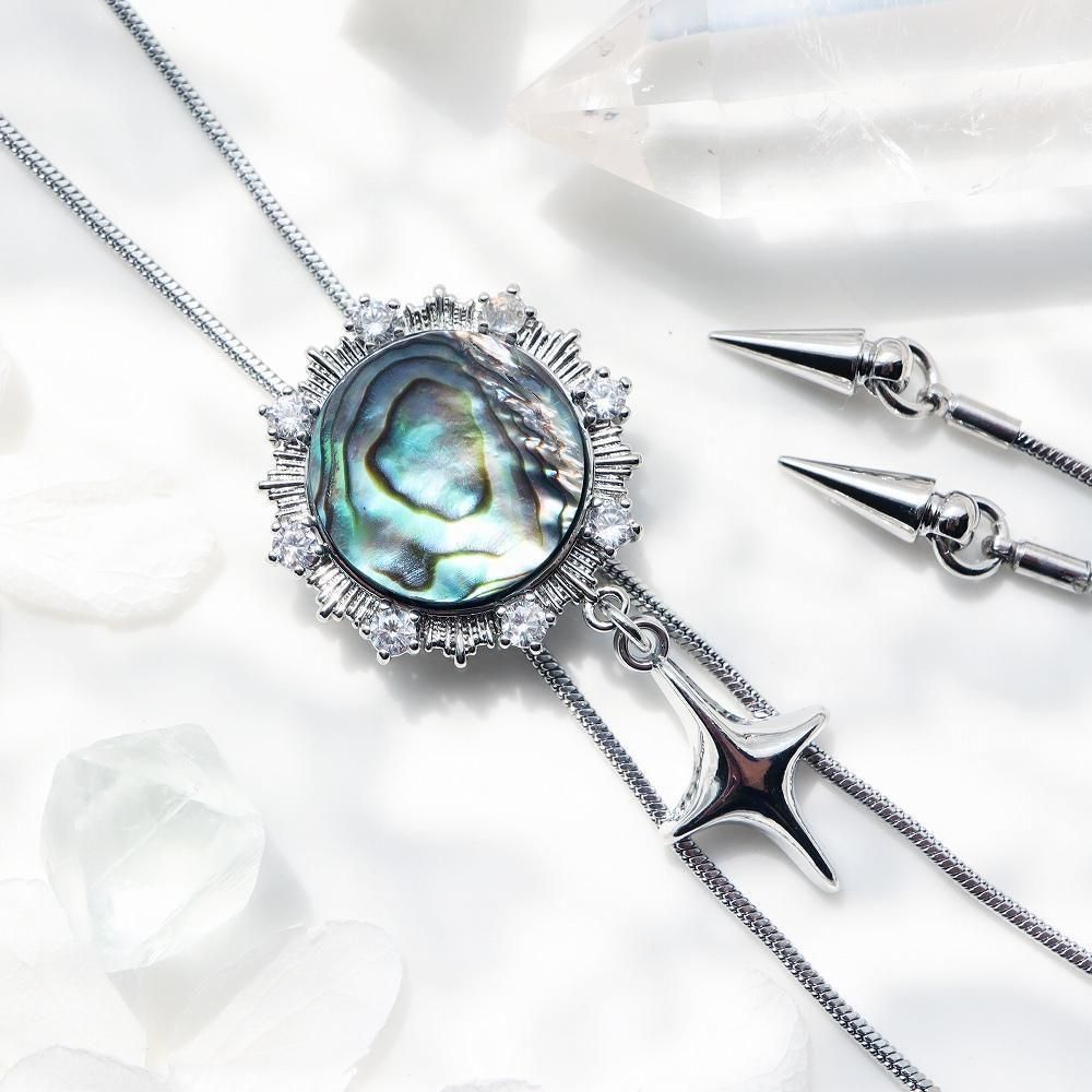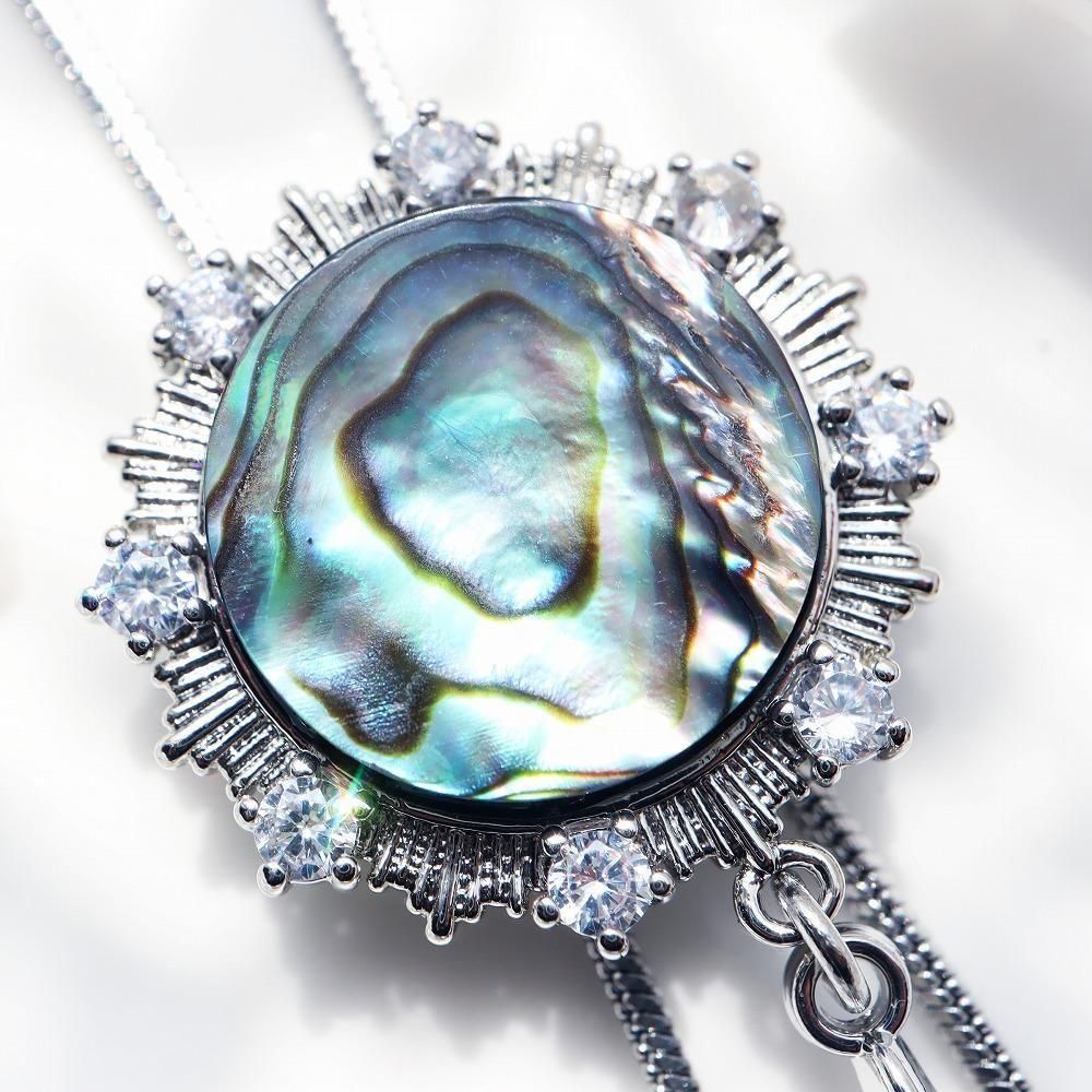 虹色に輝くアヴァロンシェルを使用したチェーンループタイです。