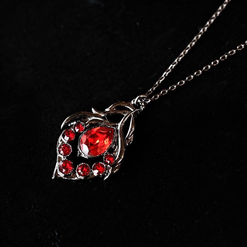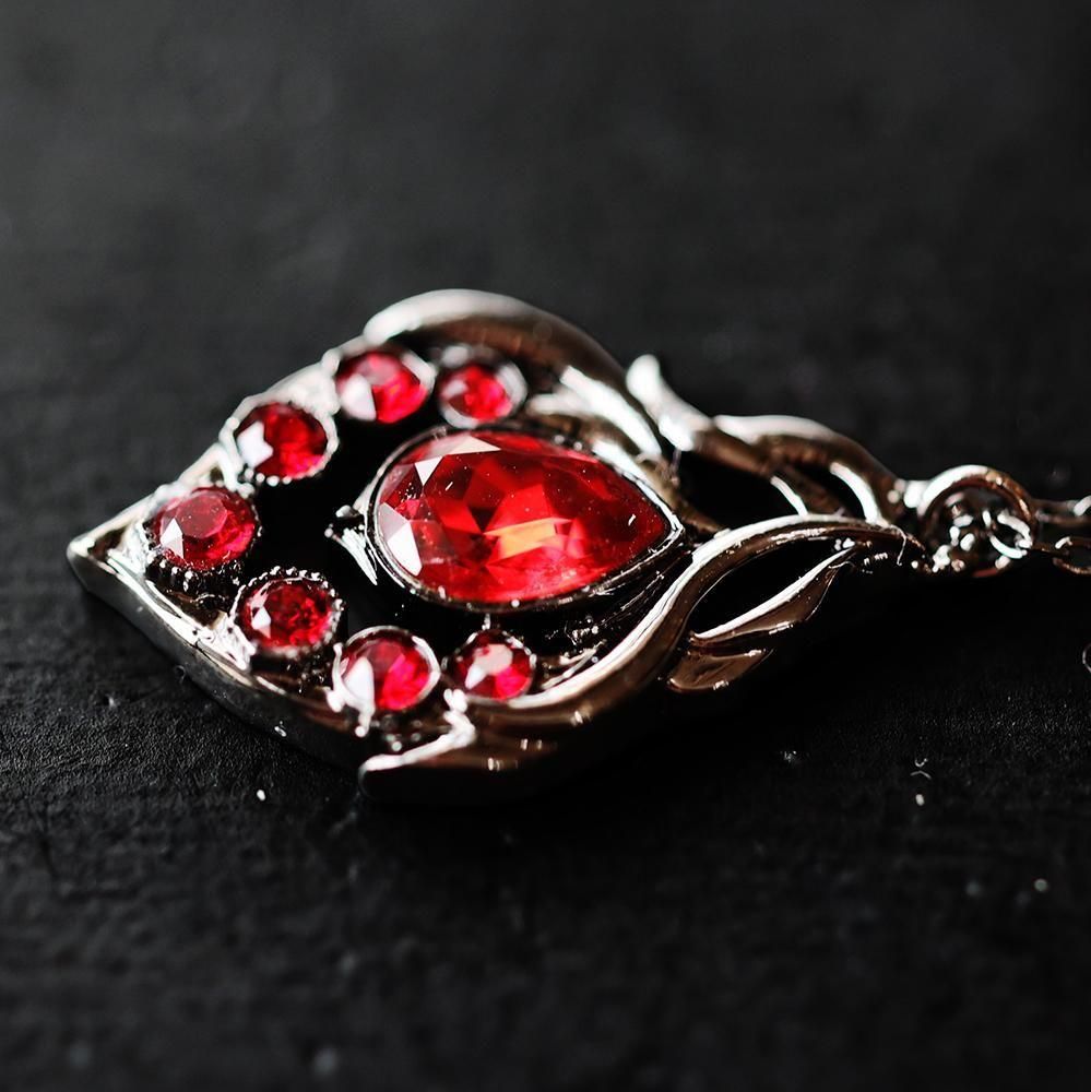 A necklace featuring a bird feather motif, adorned with a red glass stone.