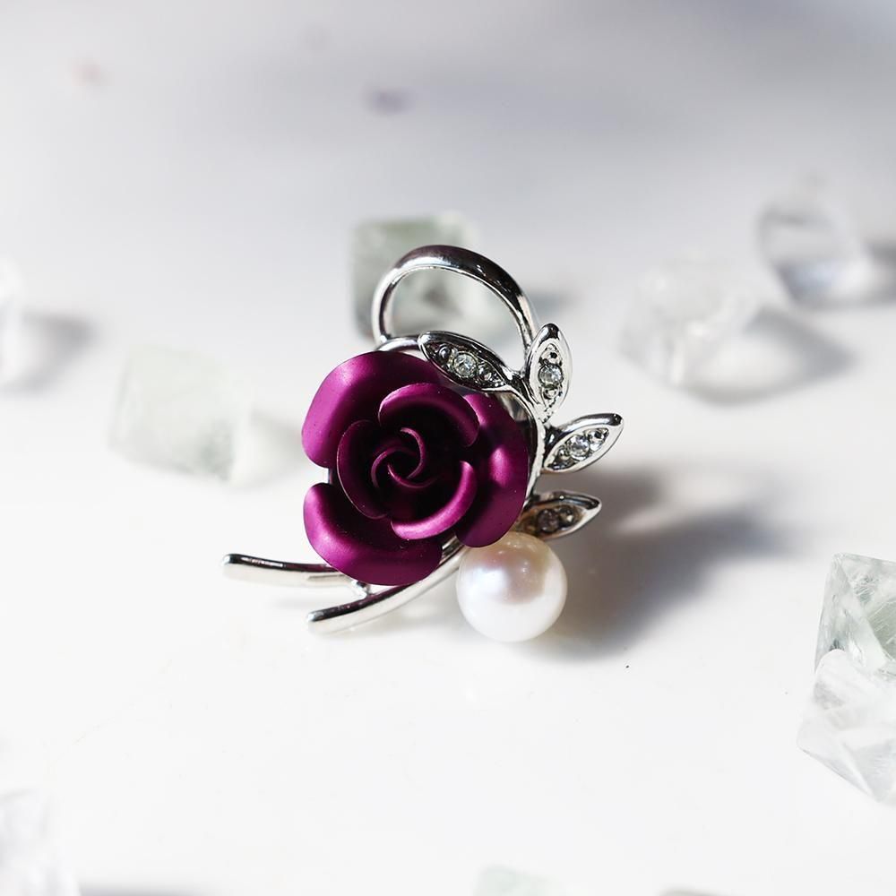 A lovely pin brooch (tack pin) featuring a purple rose and freshwater pearl. The metal parts are made of brass with a silver-colored plating. This piece can also be worn as a pendant top.