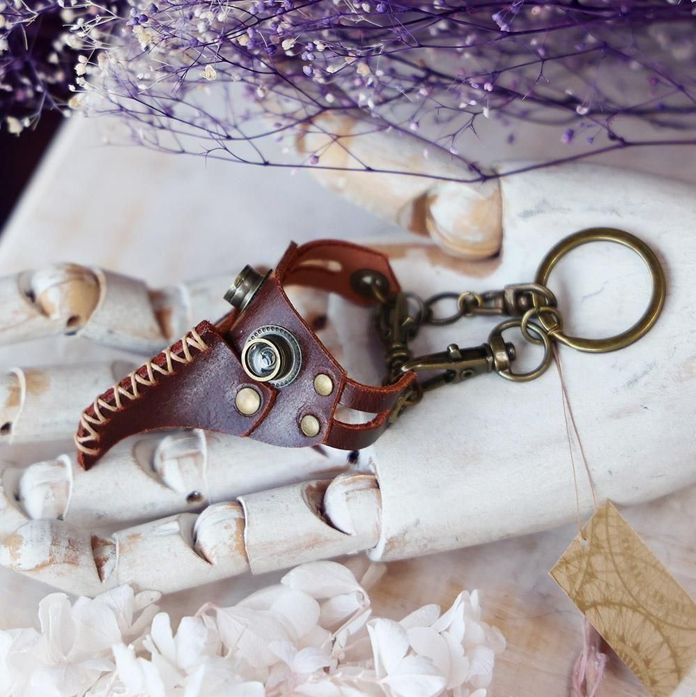 An original N845 keychain featuring a striking plague doctor mask design, crafted in leather.
