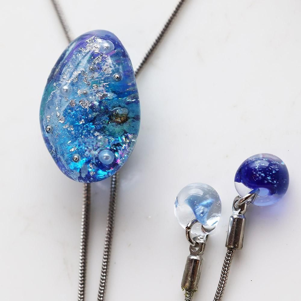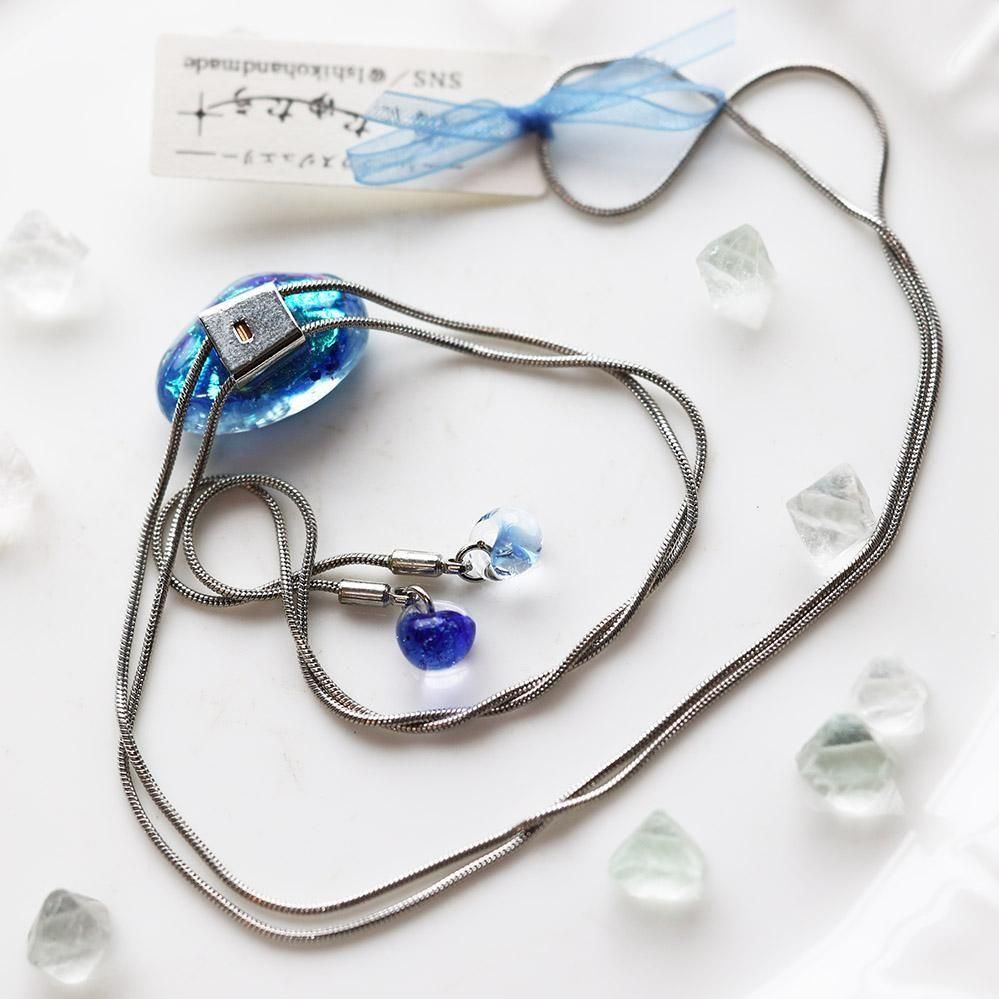 綺麗なブルーの輝きのかわいいチェーンループタイです。 コーティングしたシーグラスを使用しております。