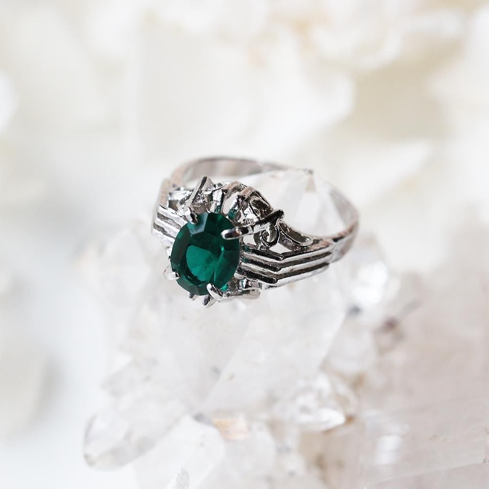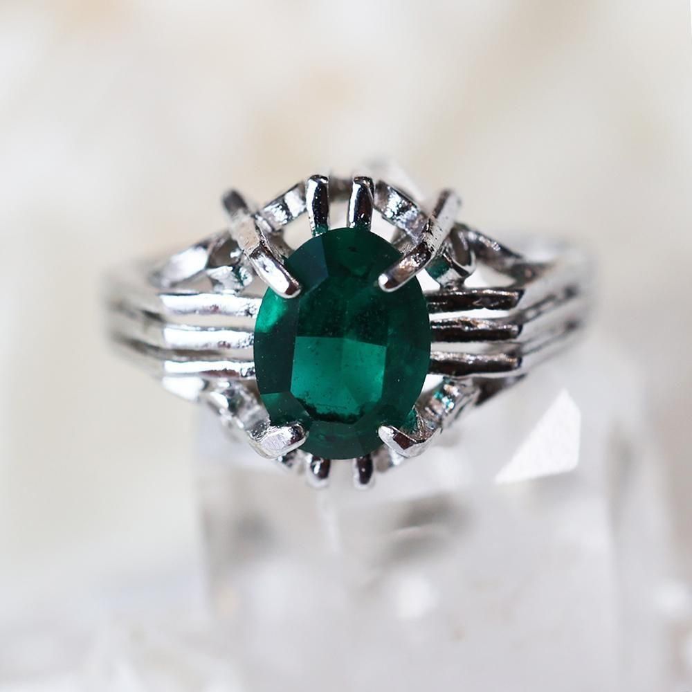 落ち着いた色合いの緑色硝子ストーンが素敵な指輪です。