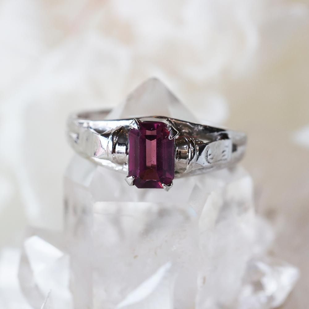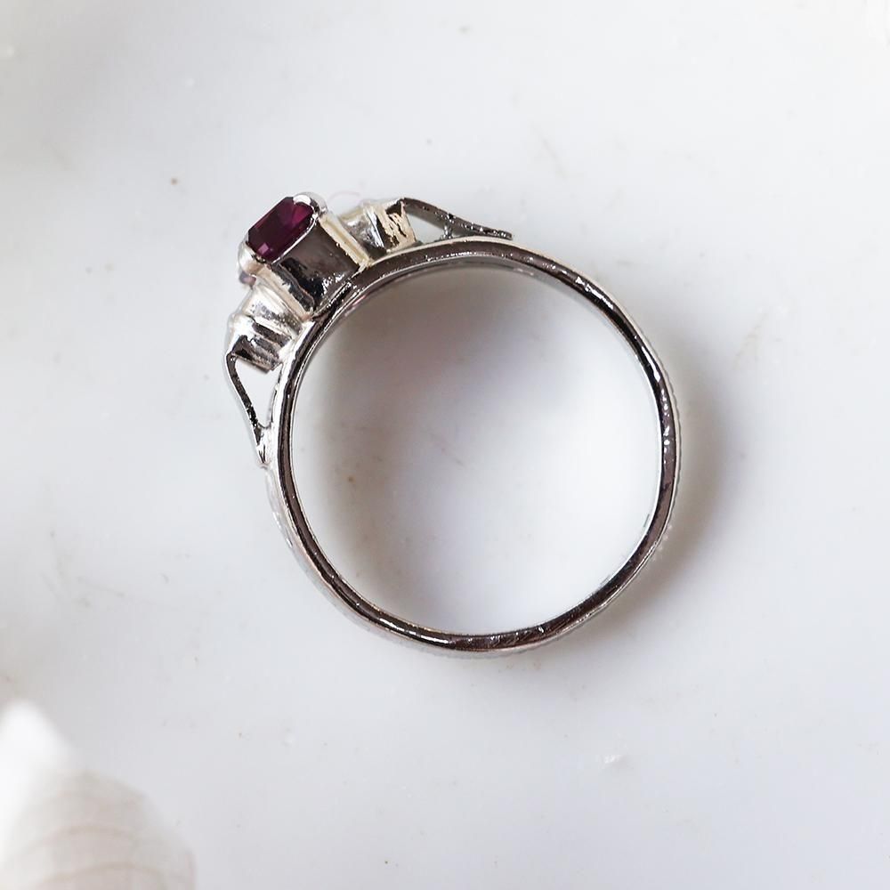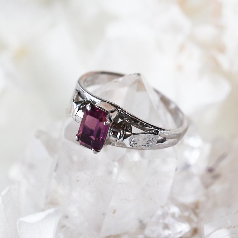 落ち着いた色合いの紫色硝子ストーンが素敵な指輪です。