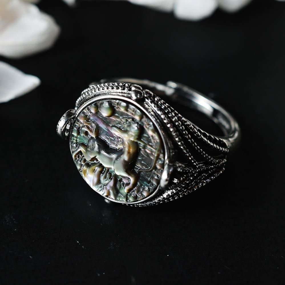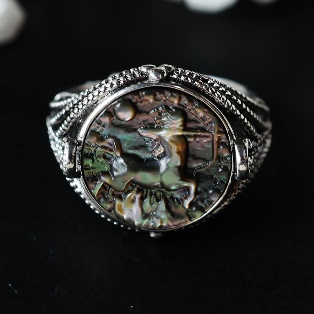 射手座のシンボルが彫刻された黒蝶貝の指輪です。
