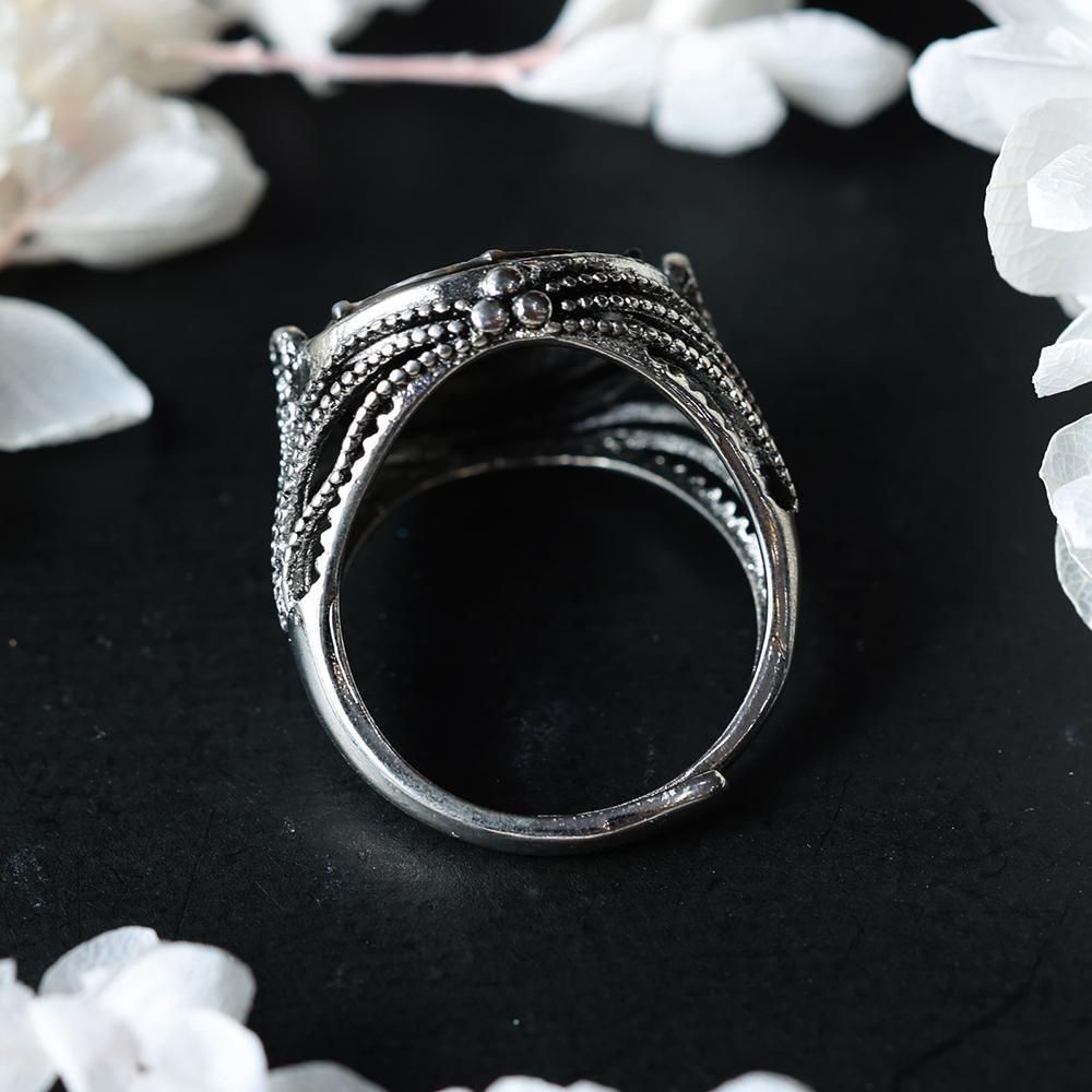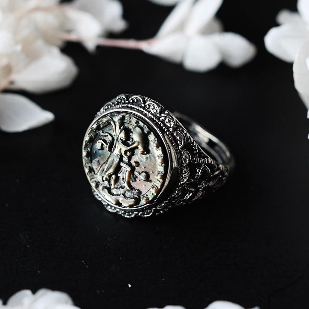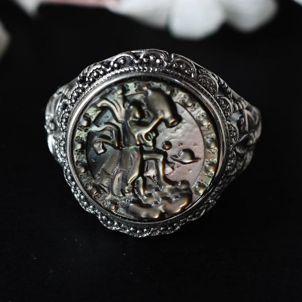水瓶座のシンボルが彫刻された黒蝶貝の指輪です。