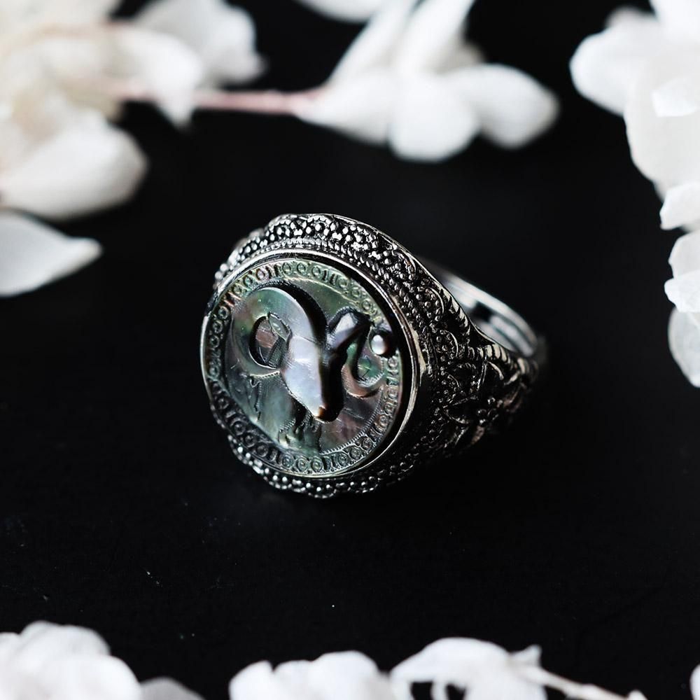 牡羊座のシンボルが彫刻された黒蝶貝の指輪です。