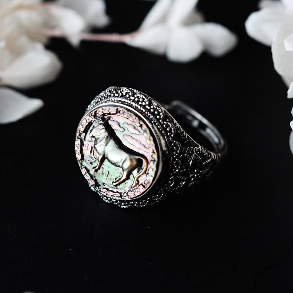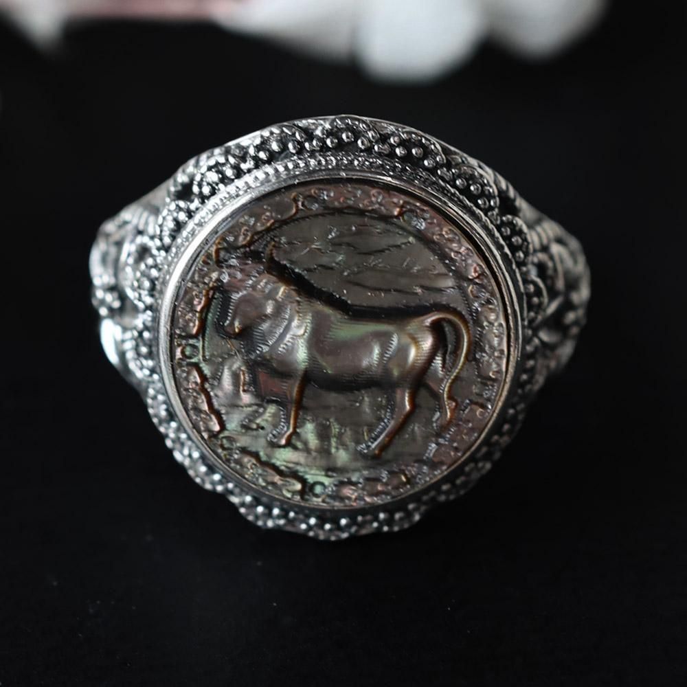 牡牛座のシンボルが彫刻された黒蝶貝の指輪です。