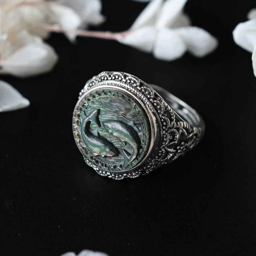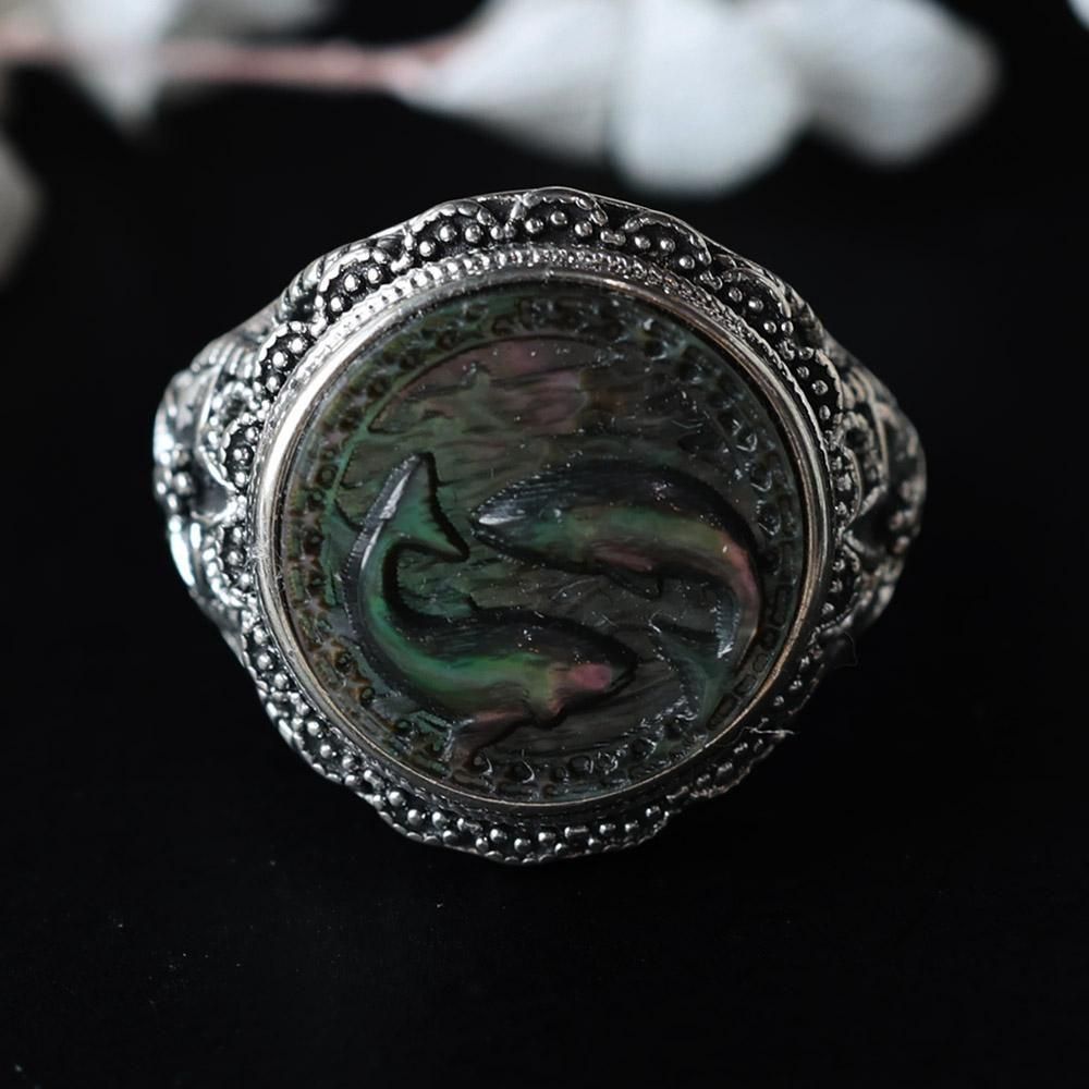 魚座のシンボルが彫刻された黒蝶貝の指輪です。