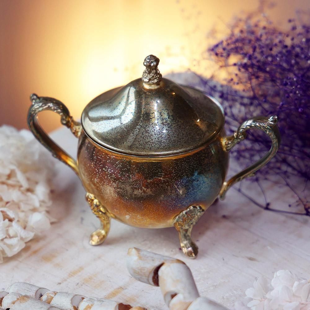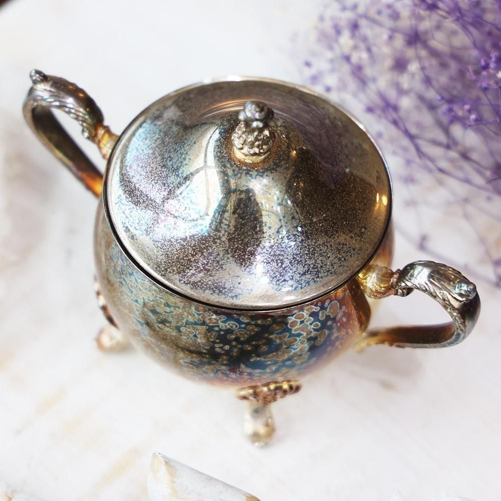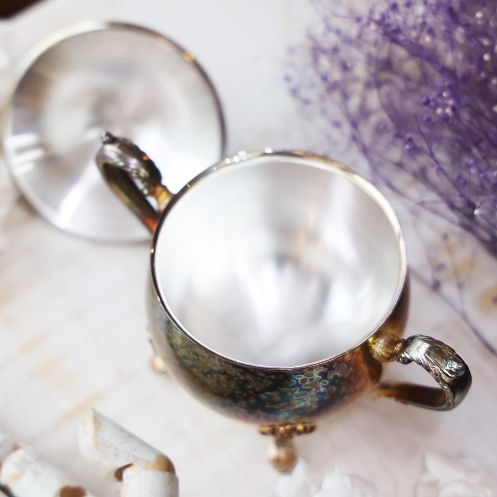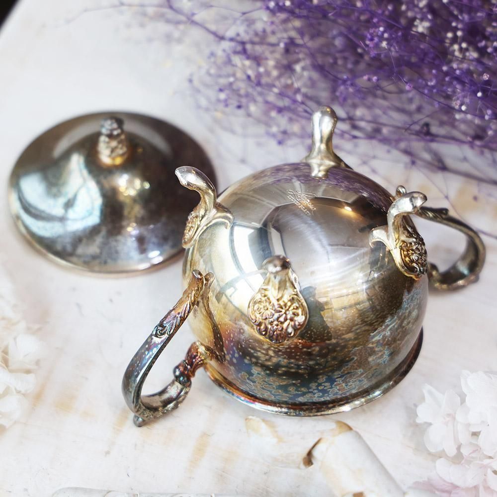 アンティーク感のある、古びた銀鍍金のシュガーポットです。