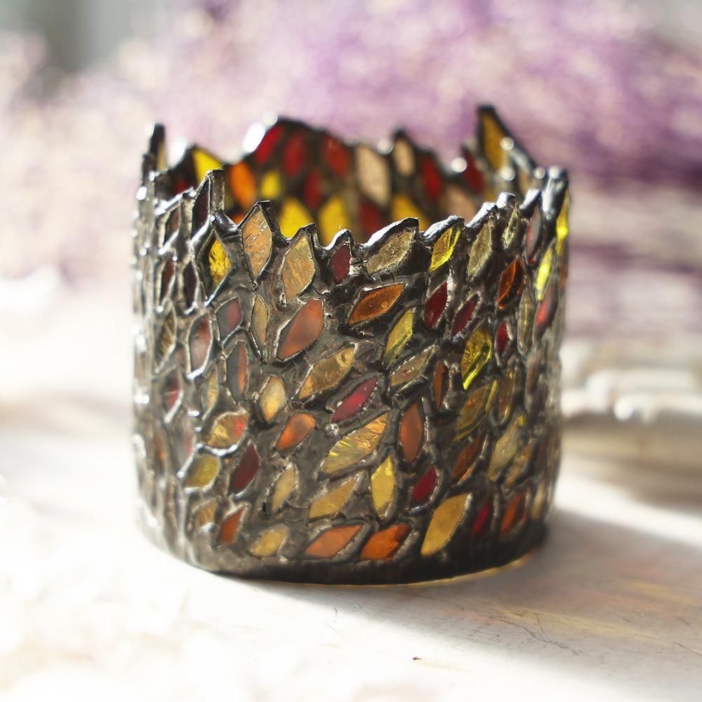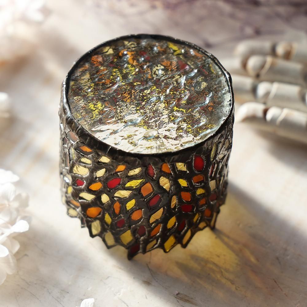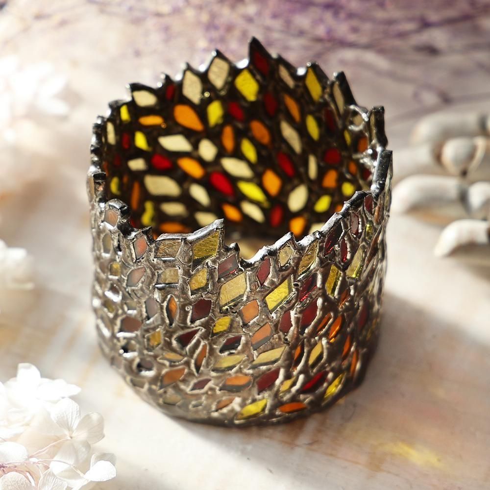 赤や黄、琥珀色の硝子が燃える炎のように連なる、