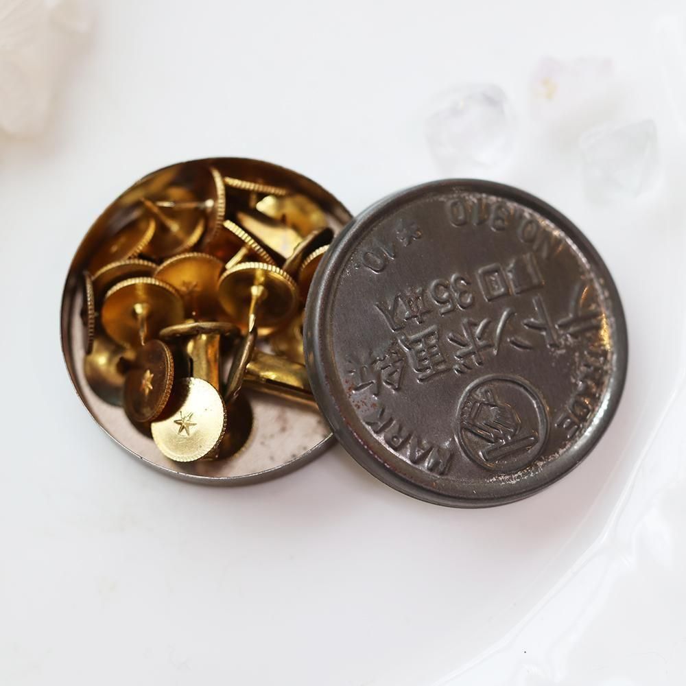 昭和レトロな風合いが可愛い、古い画鋲缶(中身入り)です。