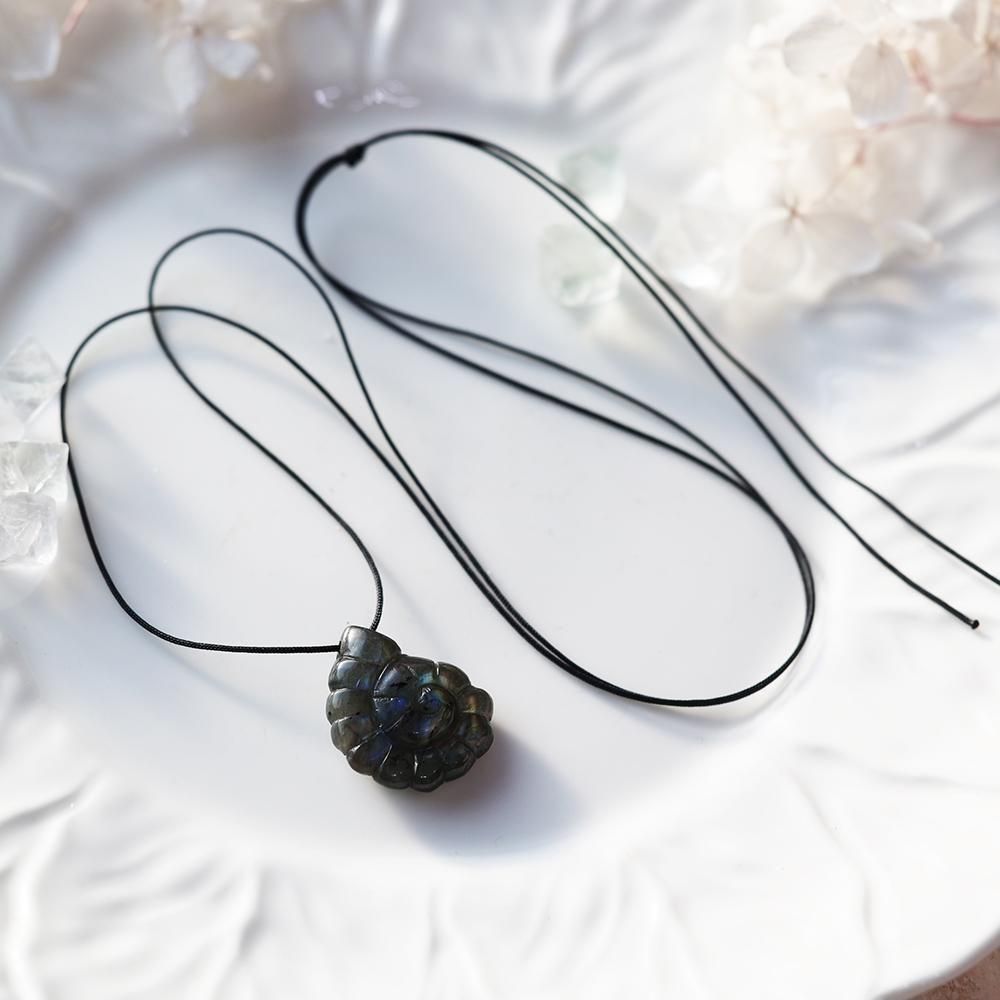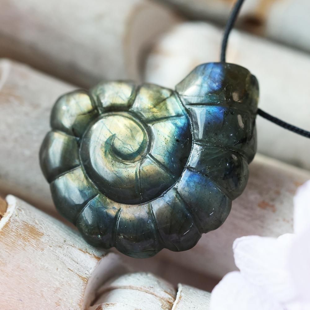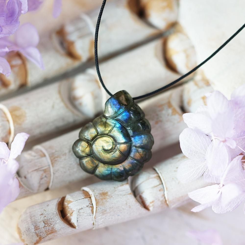アンモナイト型に彫刻されたラブラドライトのネックレスです。