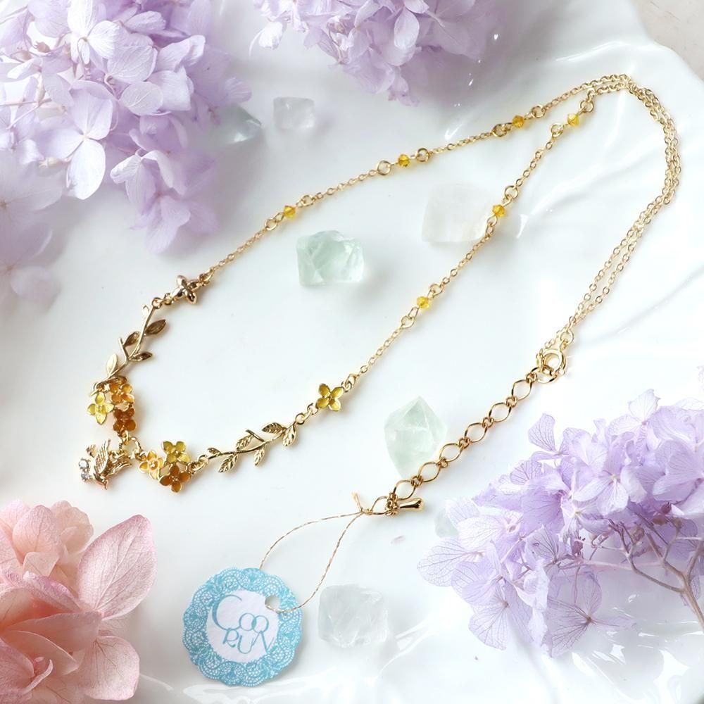 小鳥と小さな花びらが可愛らしい金木犀のネックレスです。