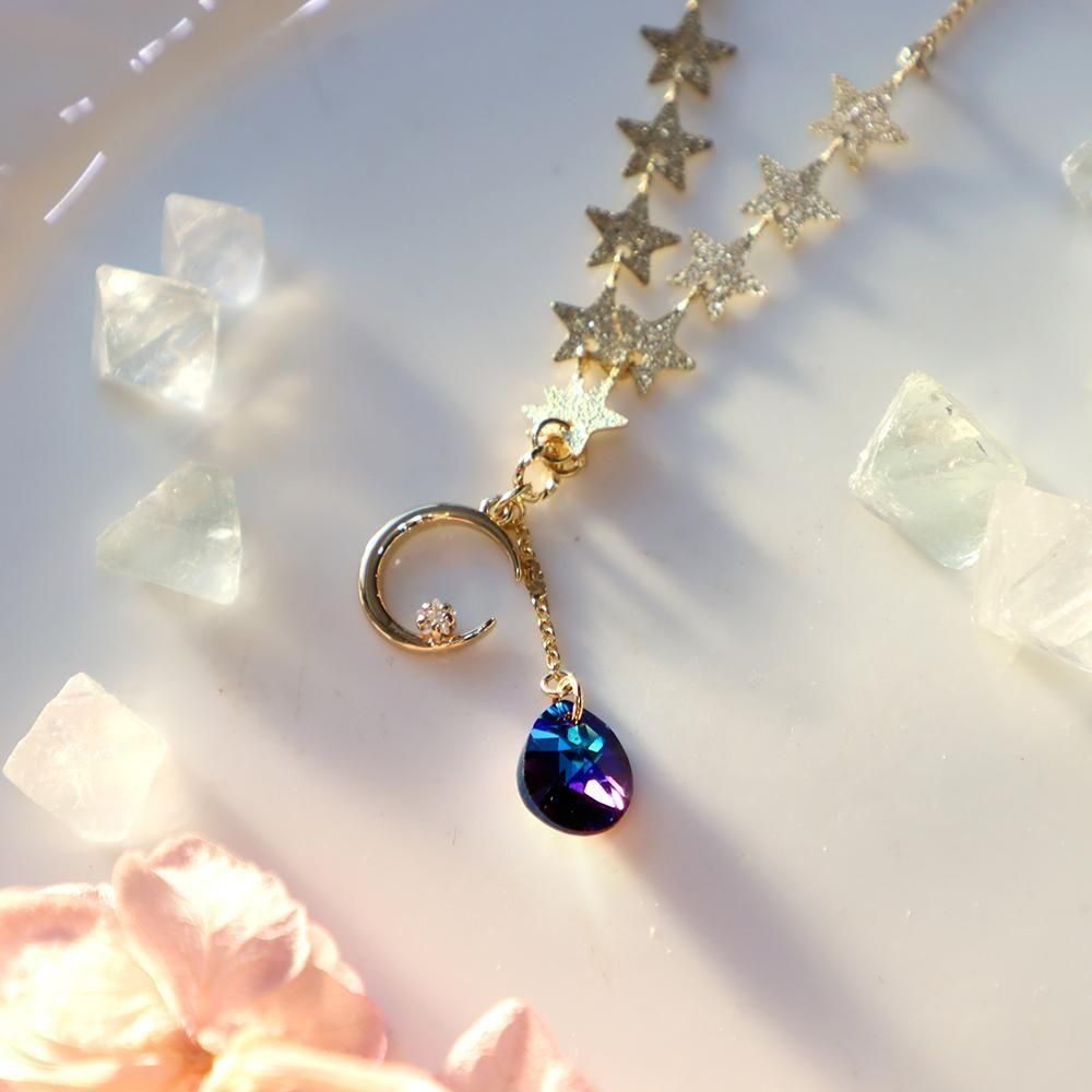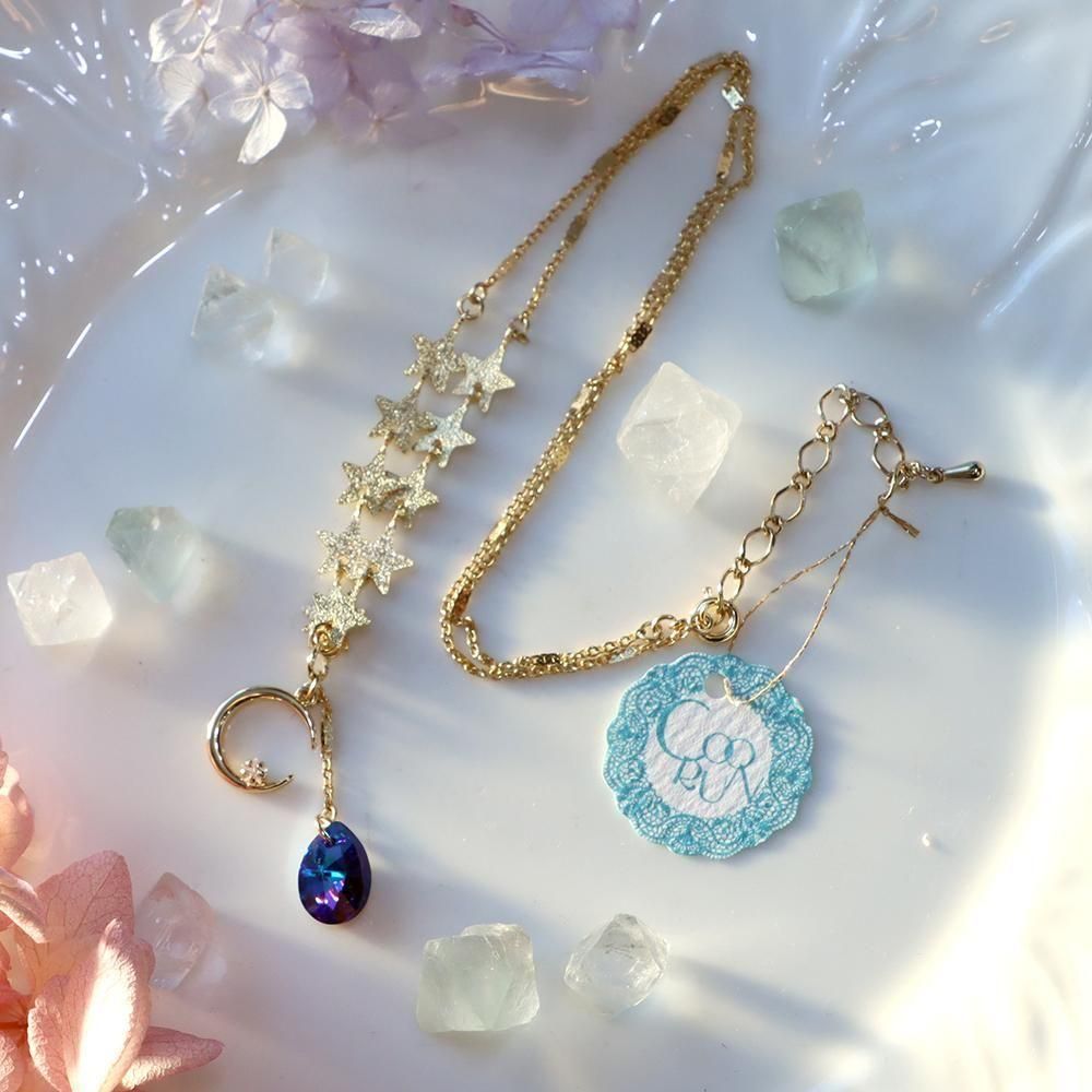 月と星と雫型の深い青が綺麗なネックレスです。