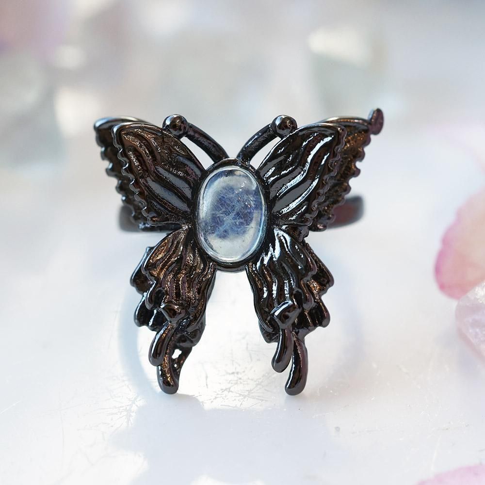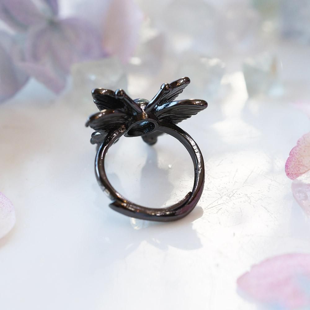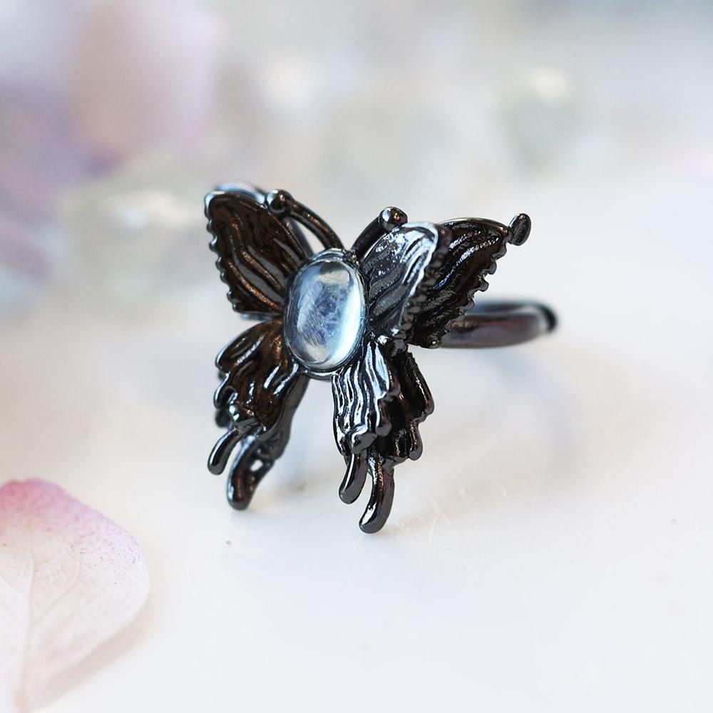 黒い蝶々のデザインが可愛い、アクアマリンの指輪です。