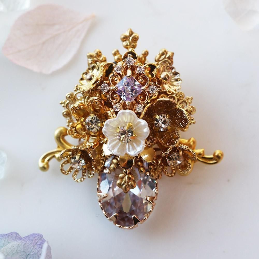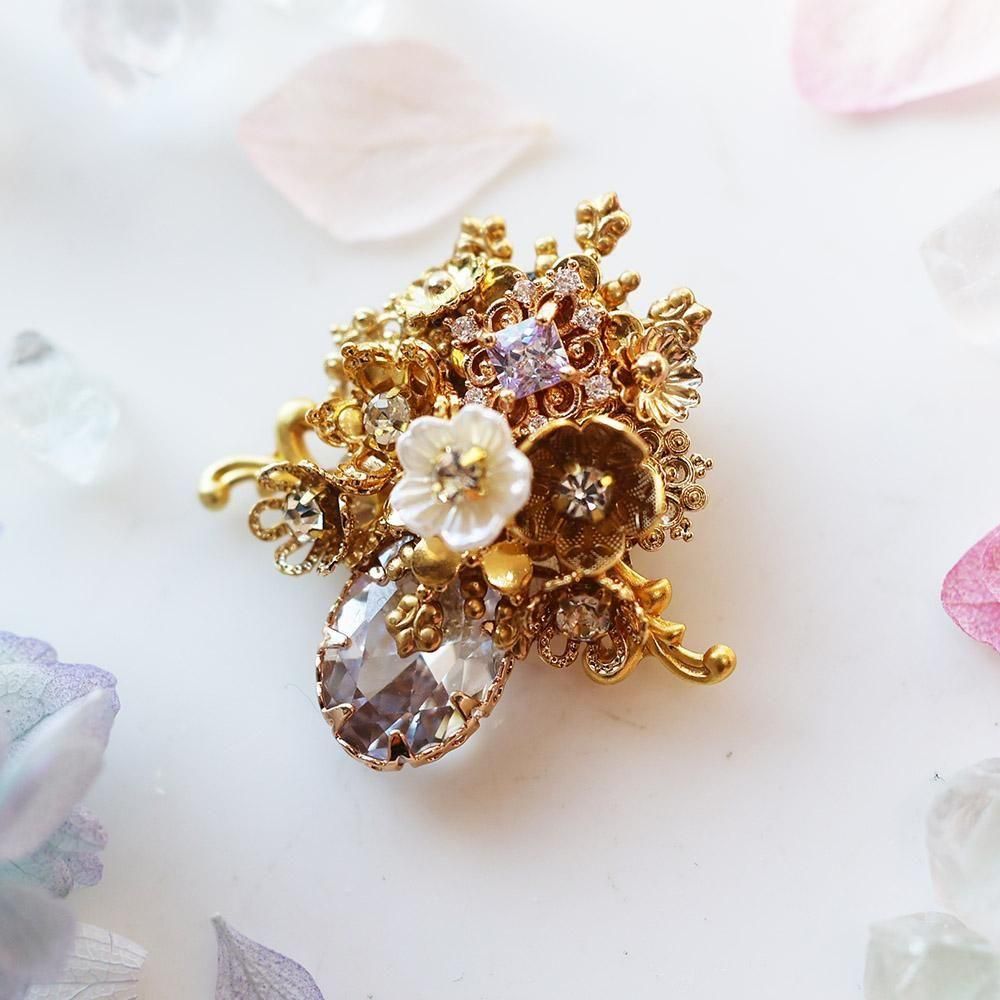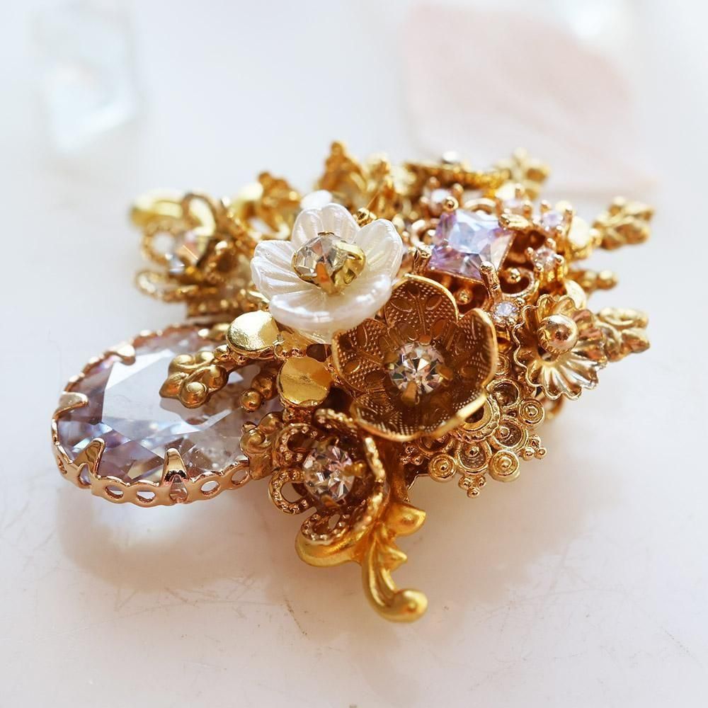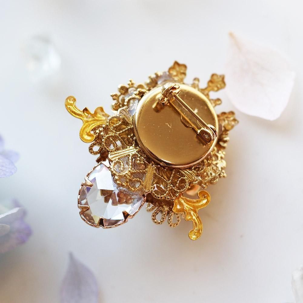 綺麗な透明の硝子ストーンと金色の装飾が素敵なブローチです。