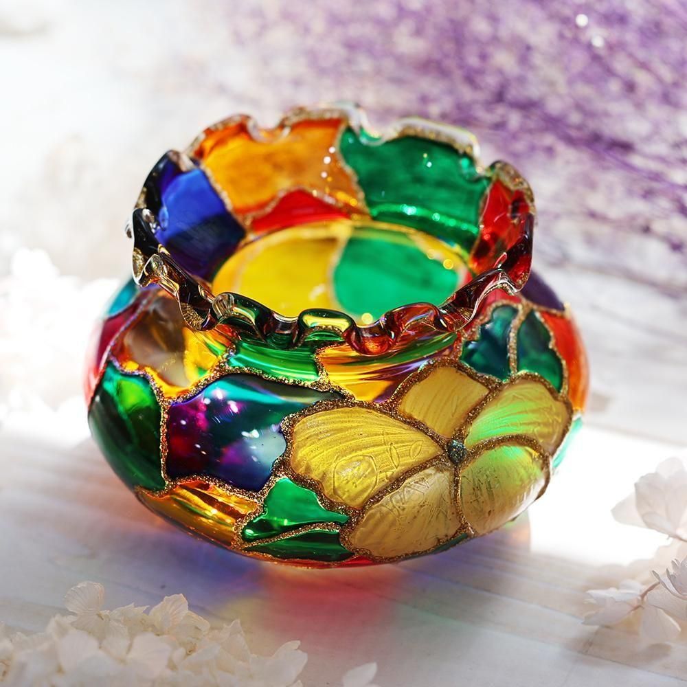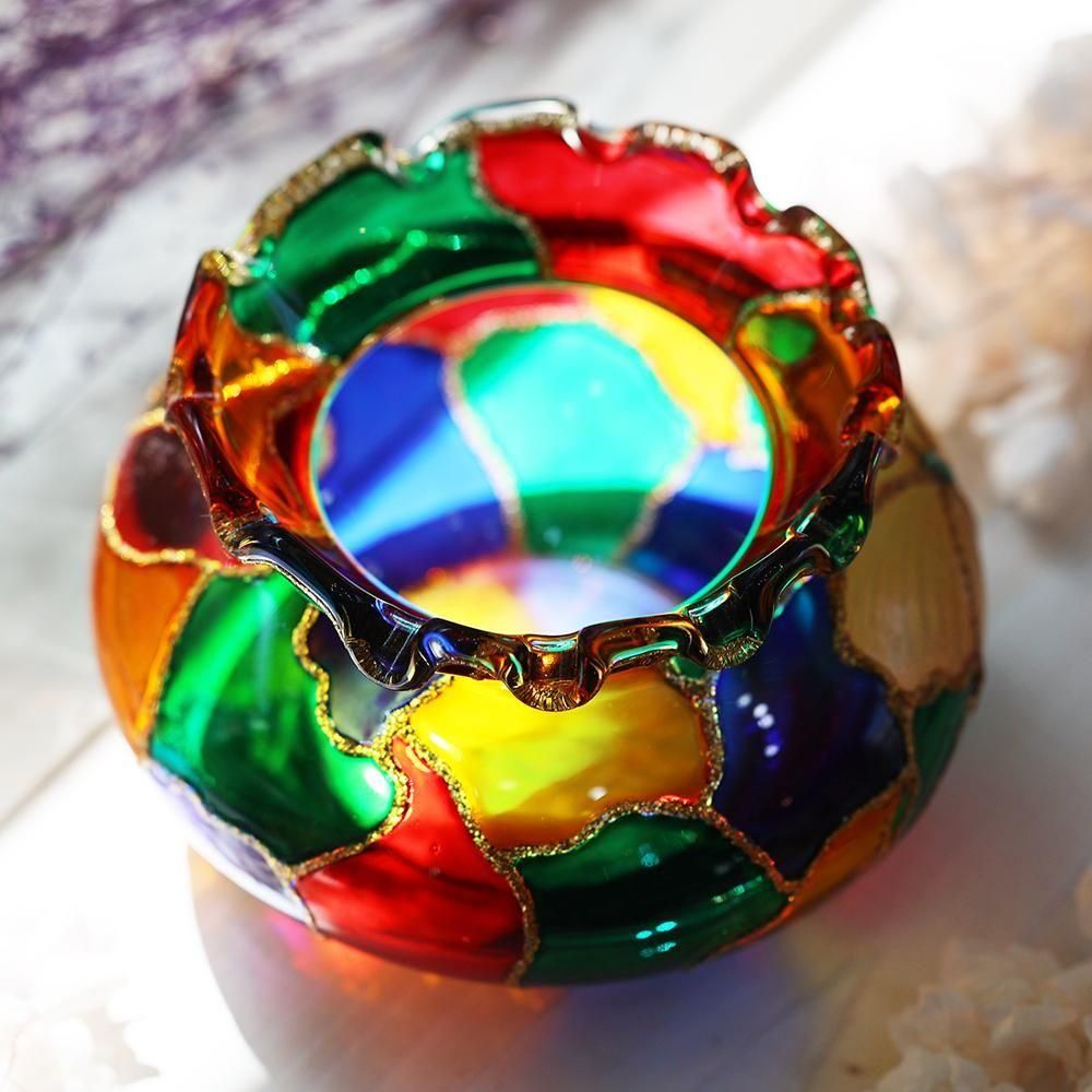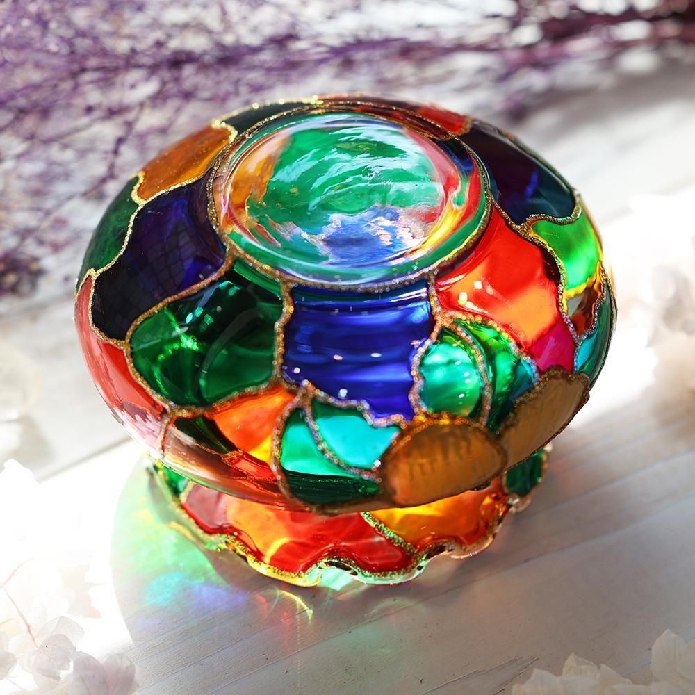 カラフルな彩色ガラスに花模様が描かれた、ステンドグラス風のフラワーベースです。