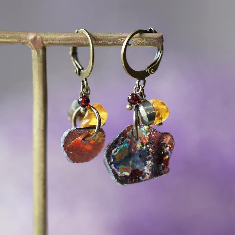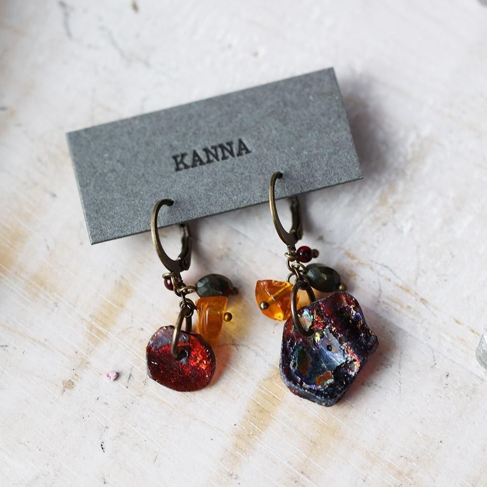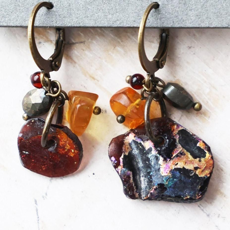 ローマングラスとシトリン、琥珀、ブルーコパル、パイライトのピアスです。