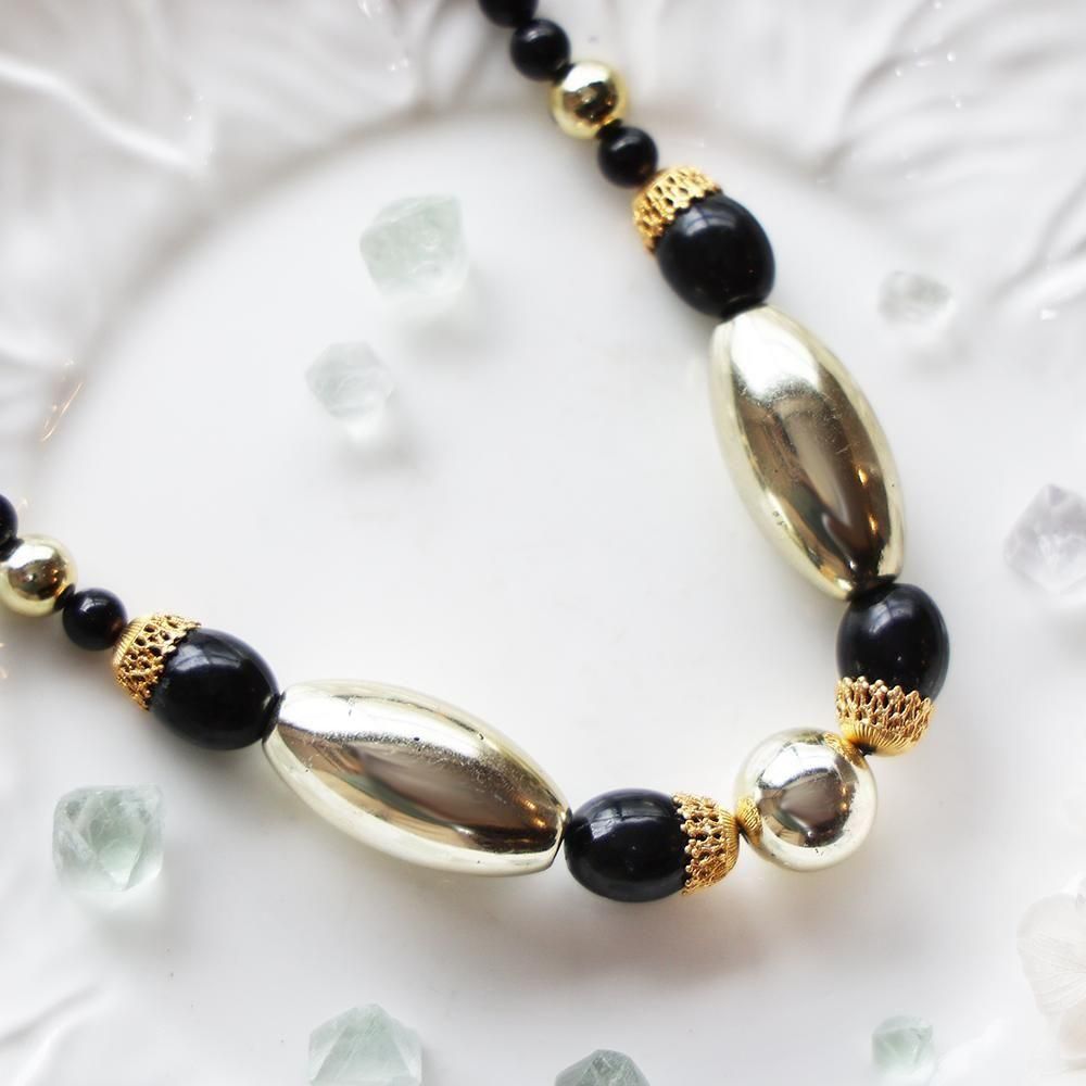 レトロ可愛い黒×金×銀の、アクリルビーズのネックレスです。