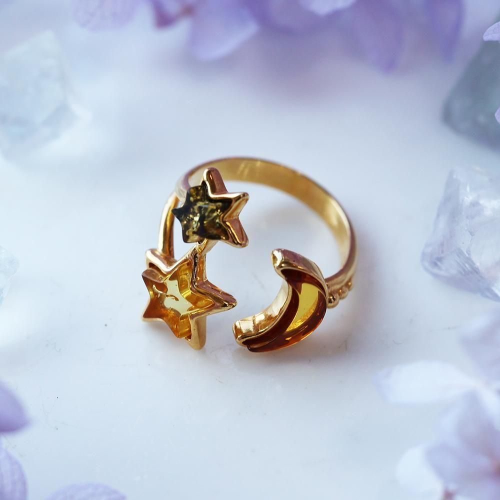星と三日月のデザインが可愛い、ポーランド産琥珀の指輪です。