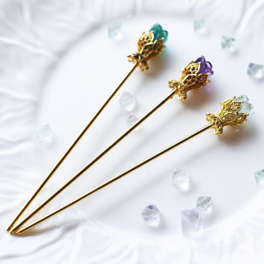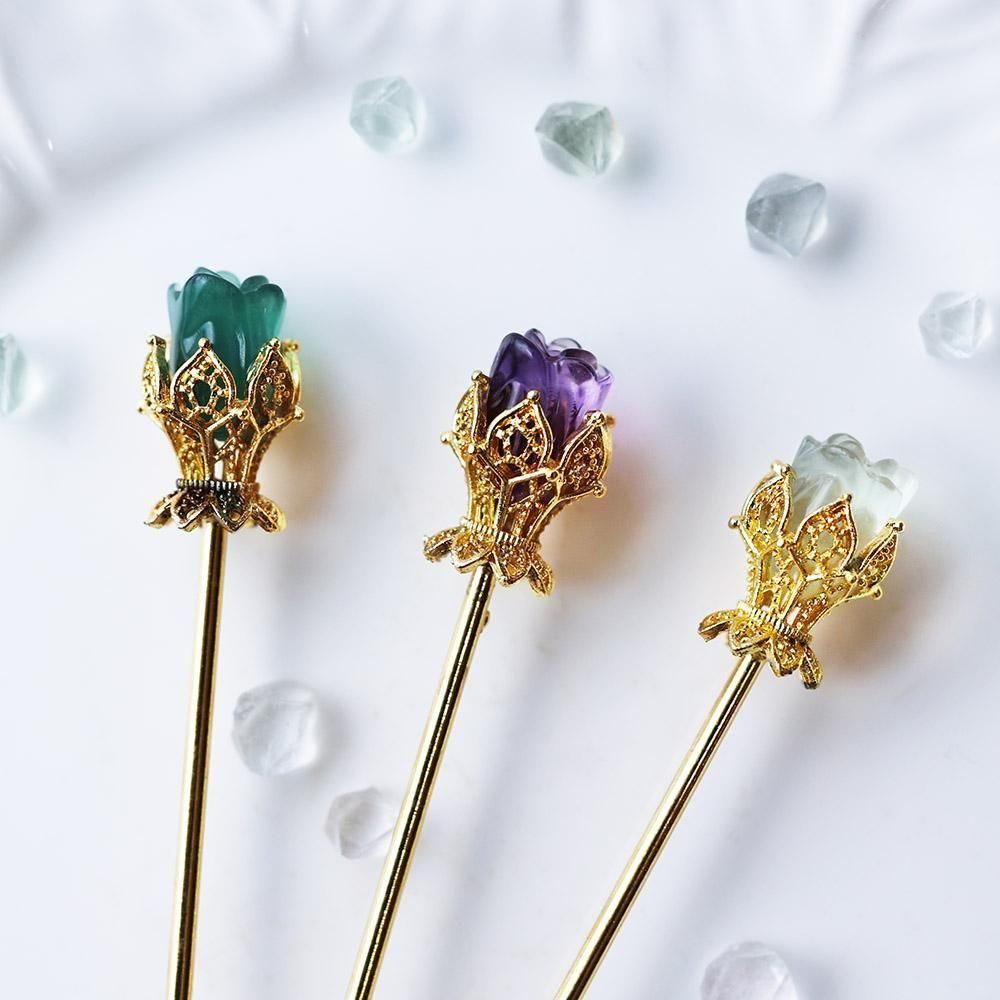 A set of three hairpins (kanzashi) featuring roses carved from fluorite.