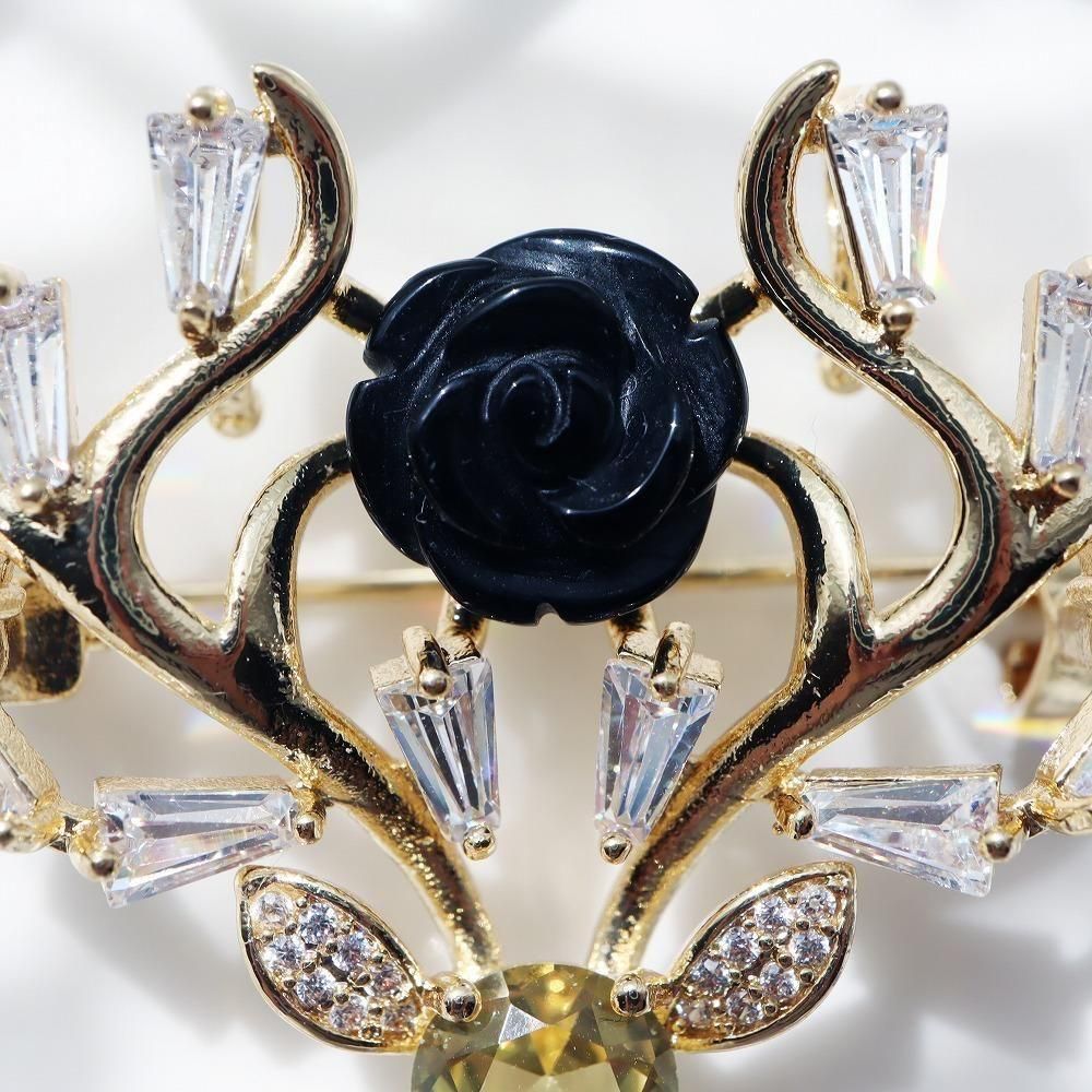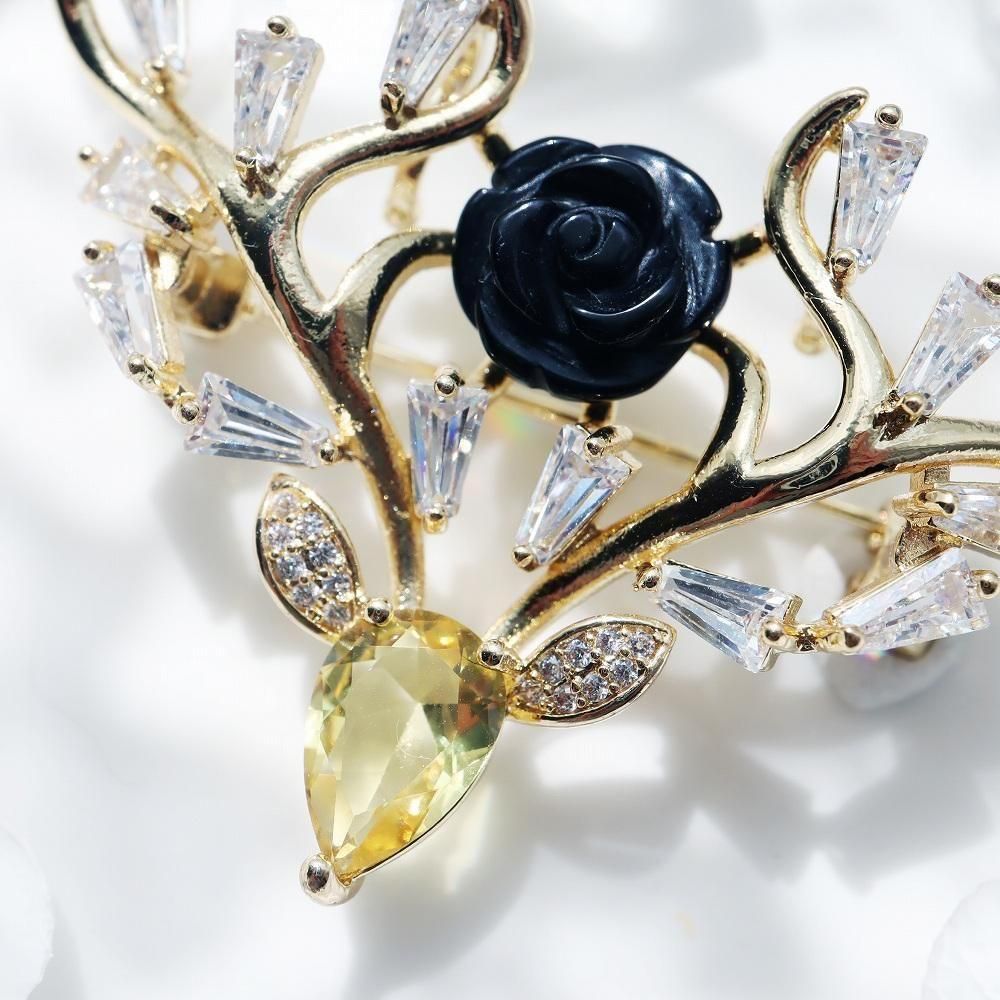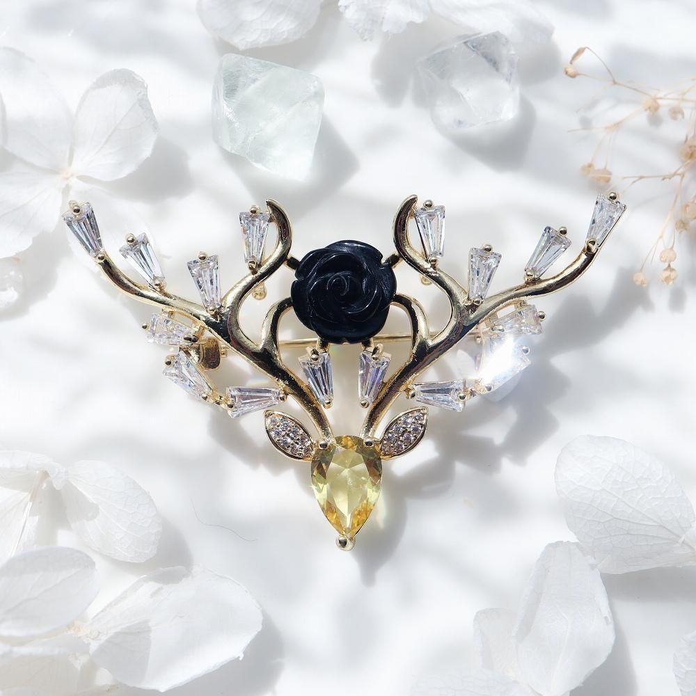 オニキス(黒瑪瑙)の薔薇をあしらった鹿のブローチです。