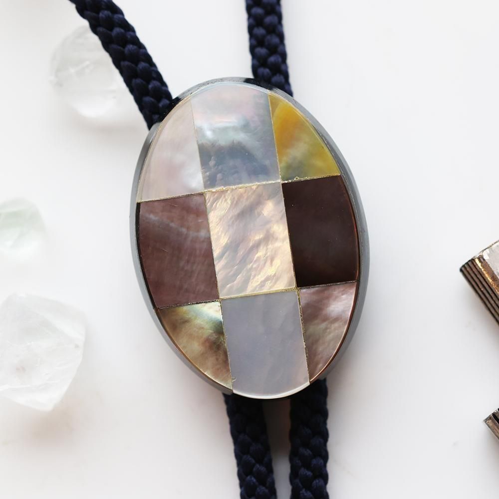 白蝶貝・黒蝶貝を市松模様のように組み合わせたループタイです。
