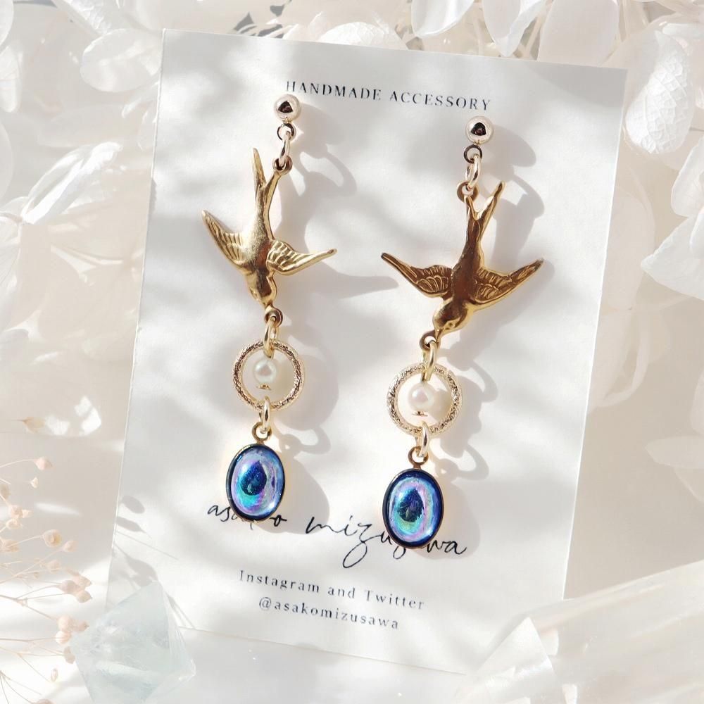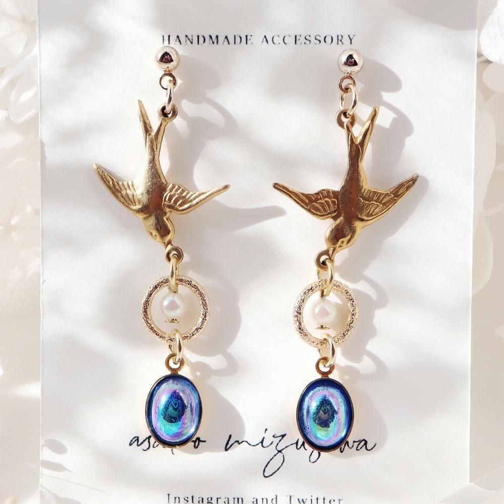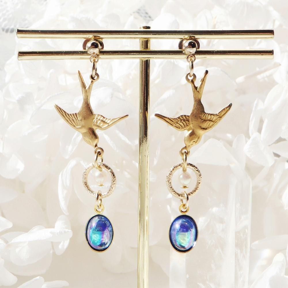 燕とヴィンテージガラスのピアスです。