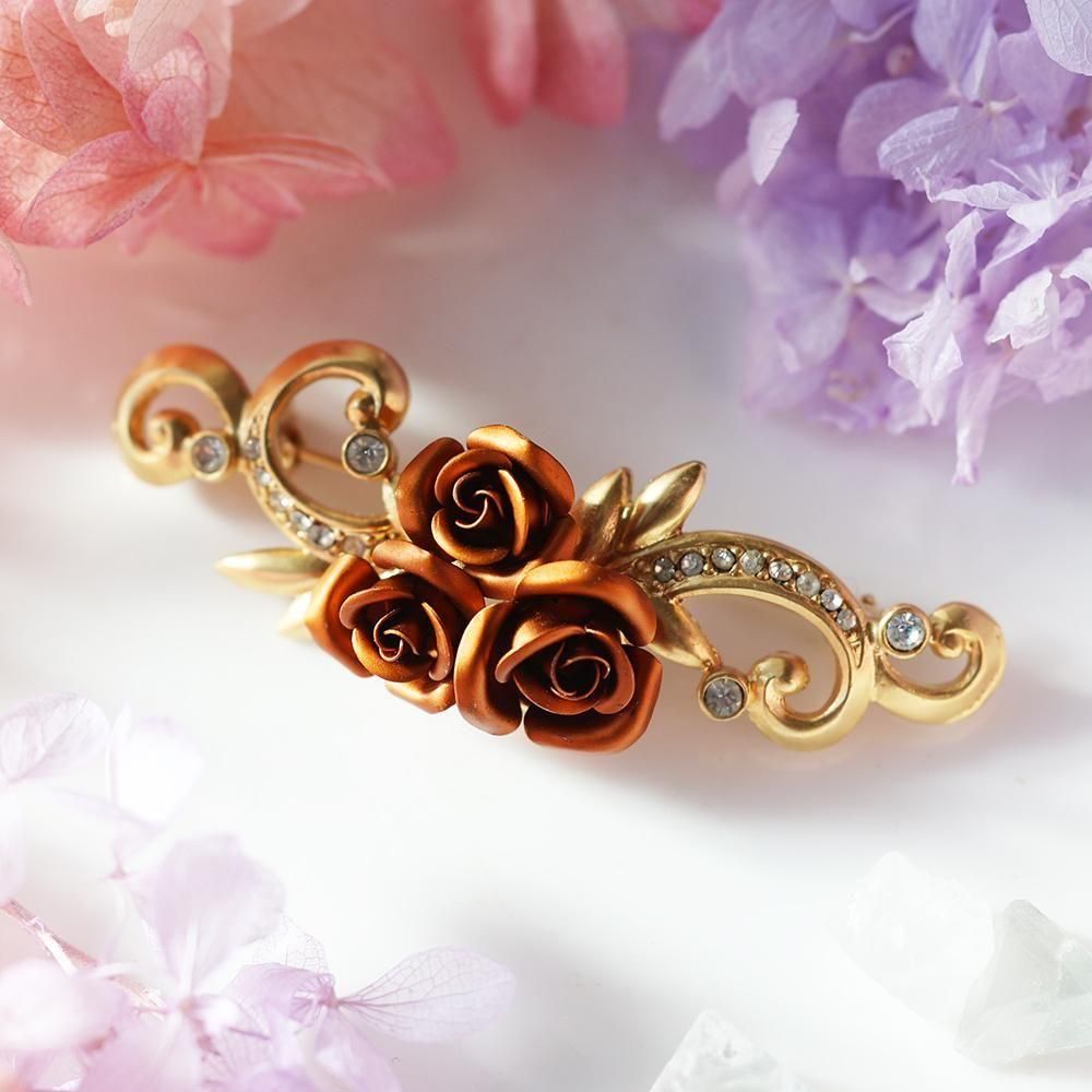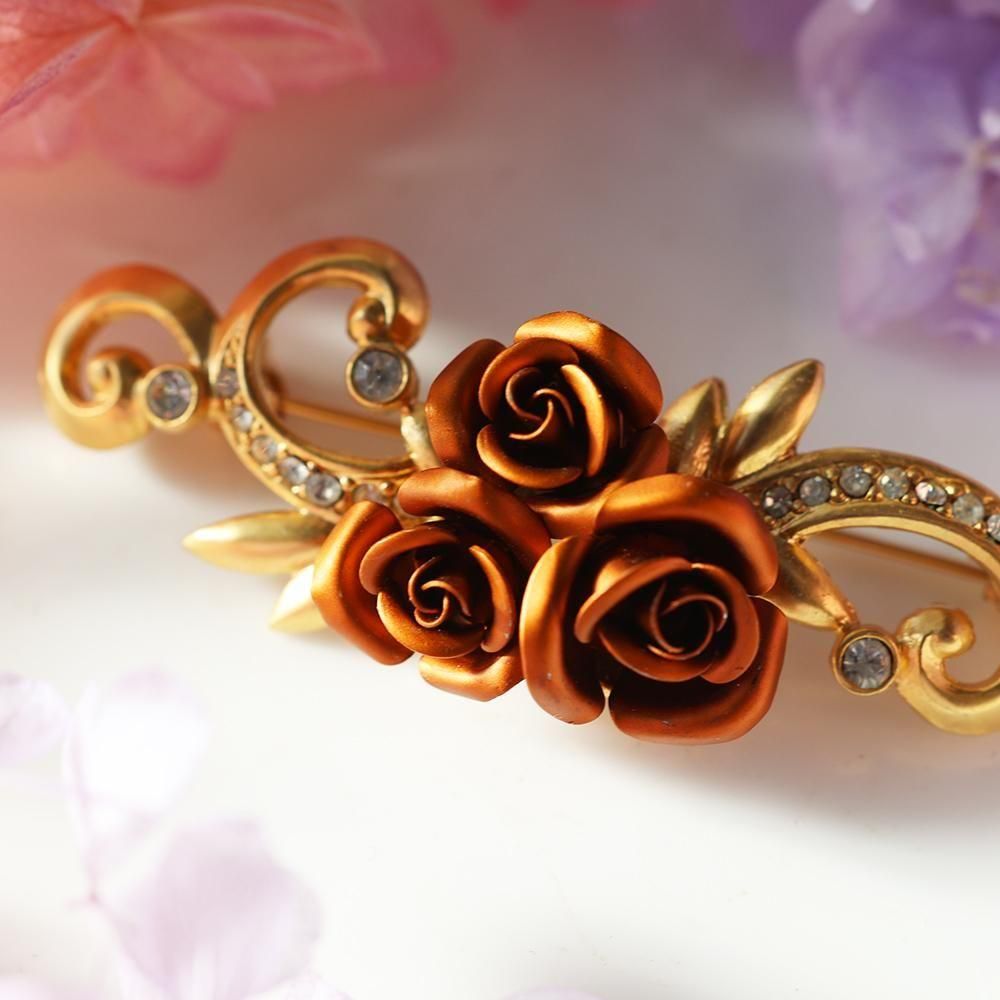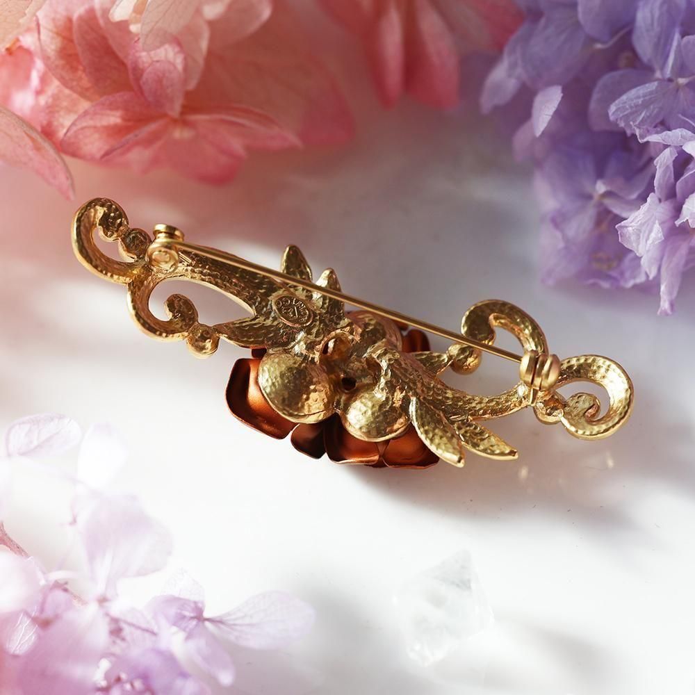 マロン色の薔薇と装飾が可愛い、金色のブローチです。