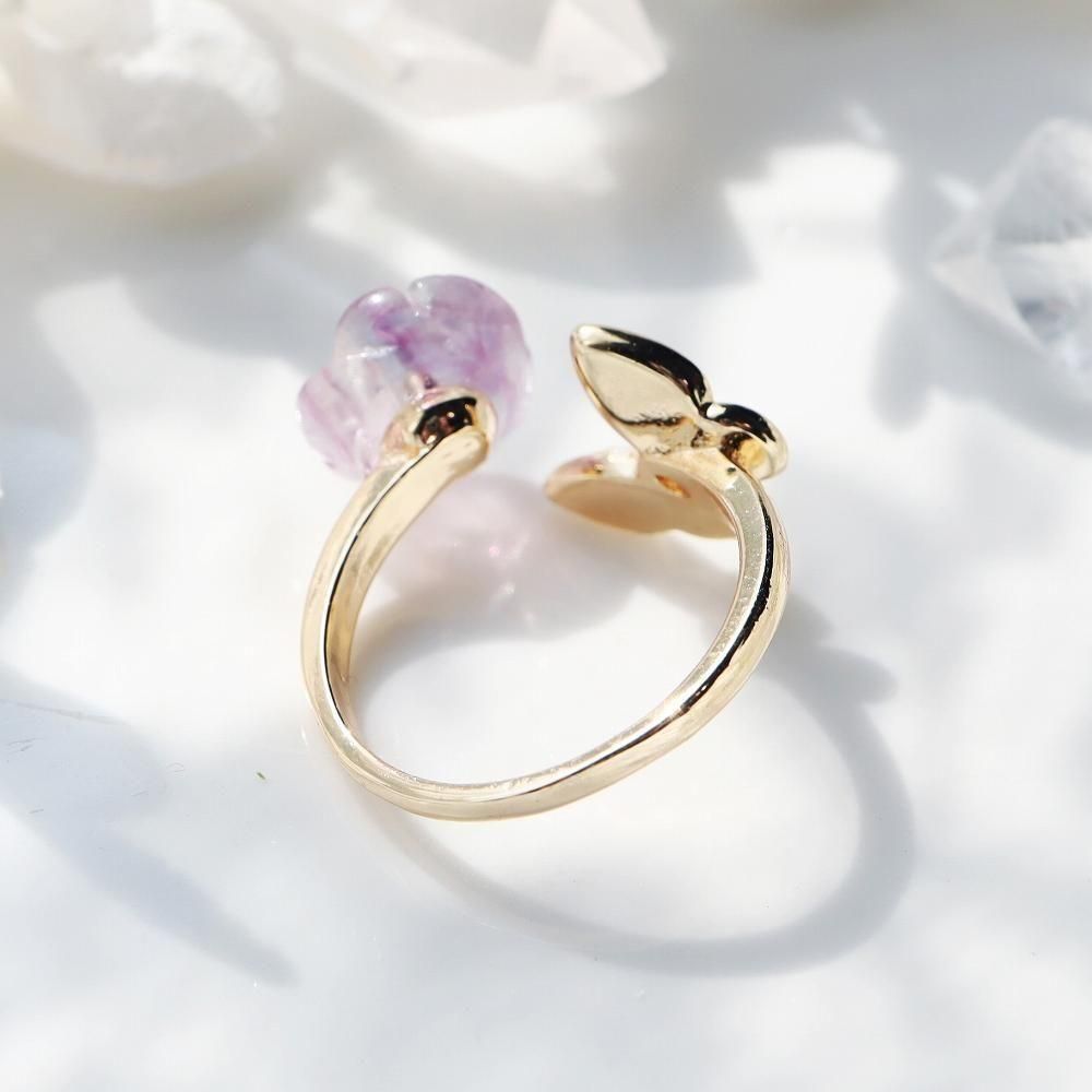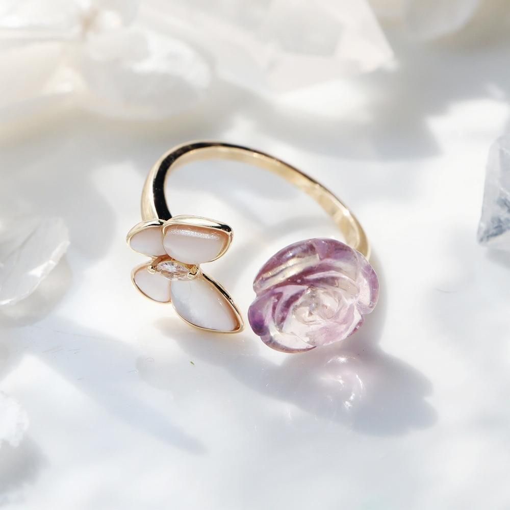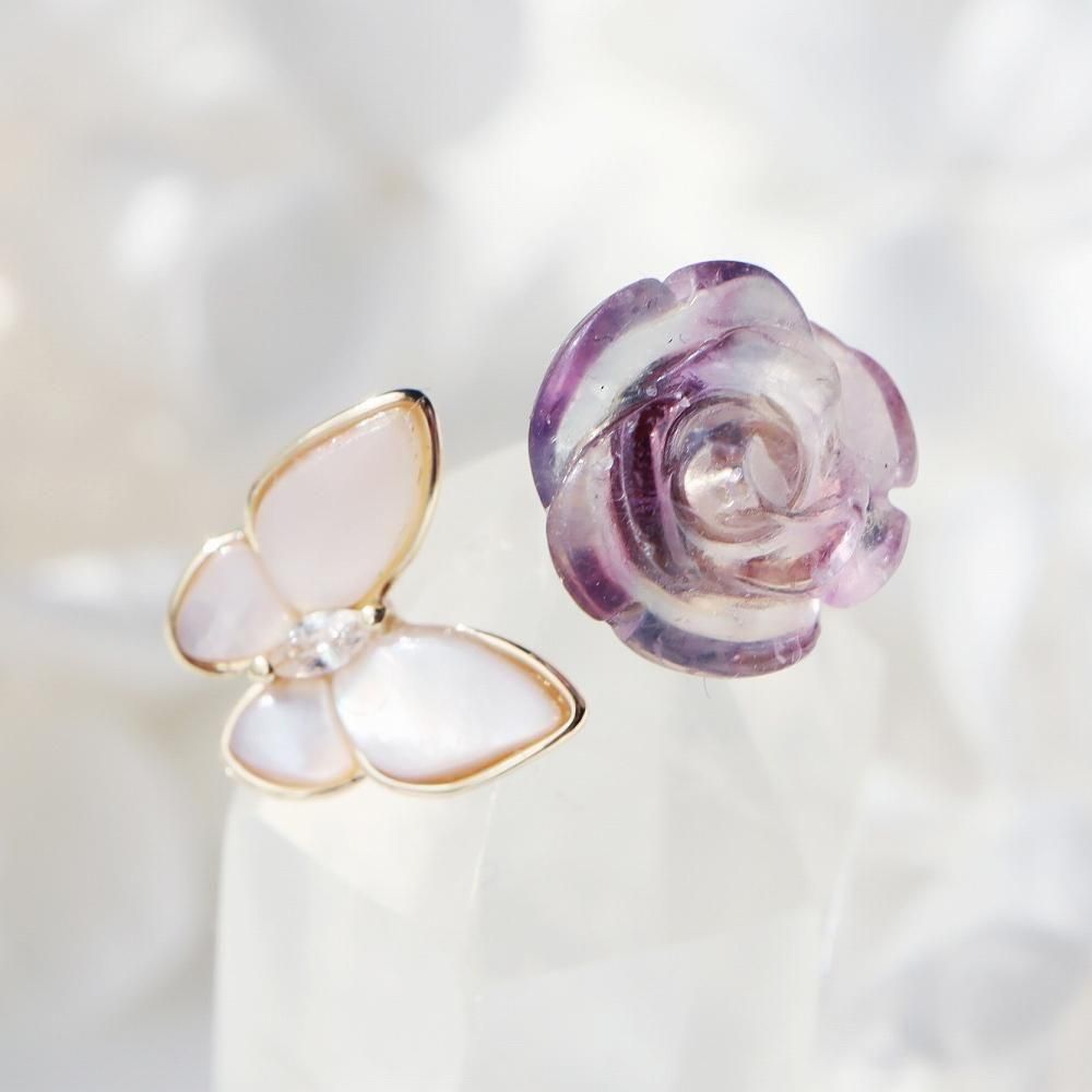 シェルの蝶とフローライト(蛍石)の薔薇のリングです。
