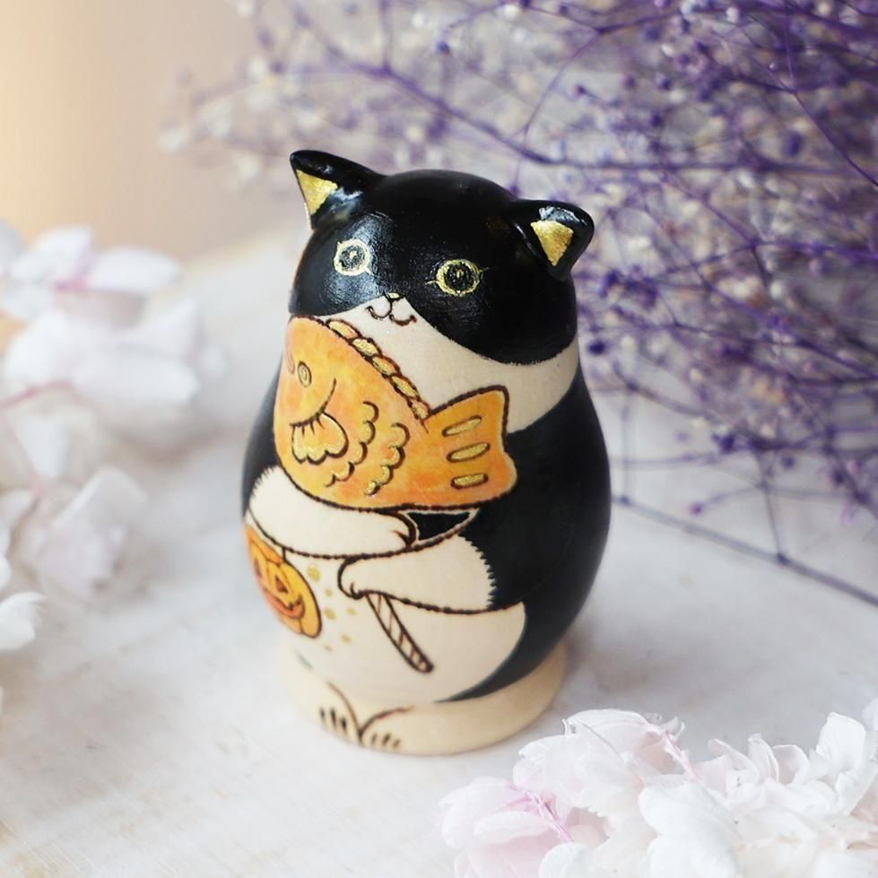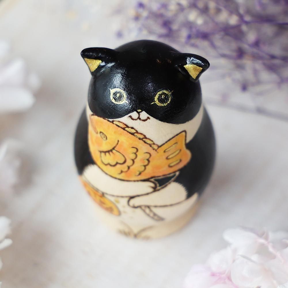 ちょこんとした耳が可愛い、たい焼きキャンディを抱えた猫のミニマトリョーシカです。