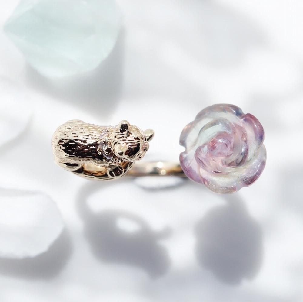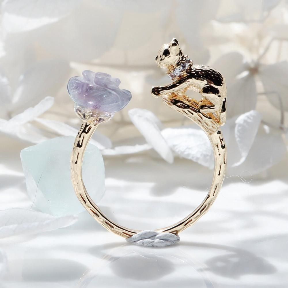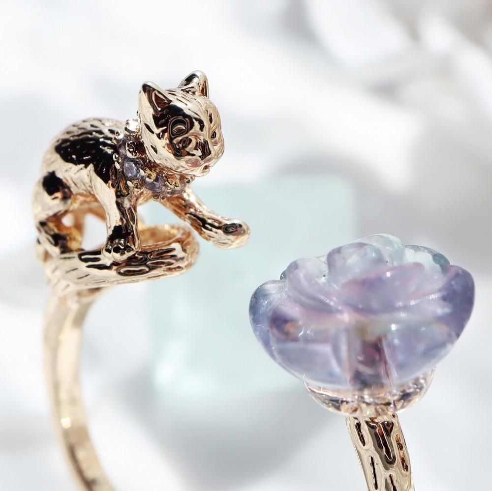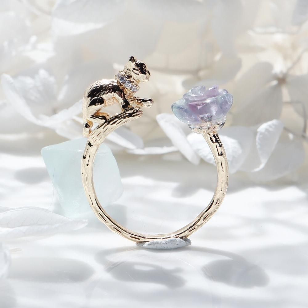 フローライト(蛍石)の薔薇にじゃれる子猫のリングです。