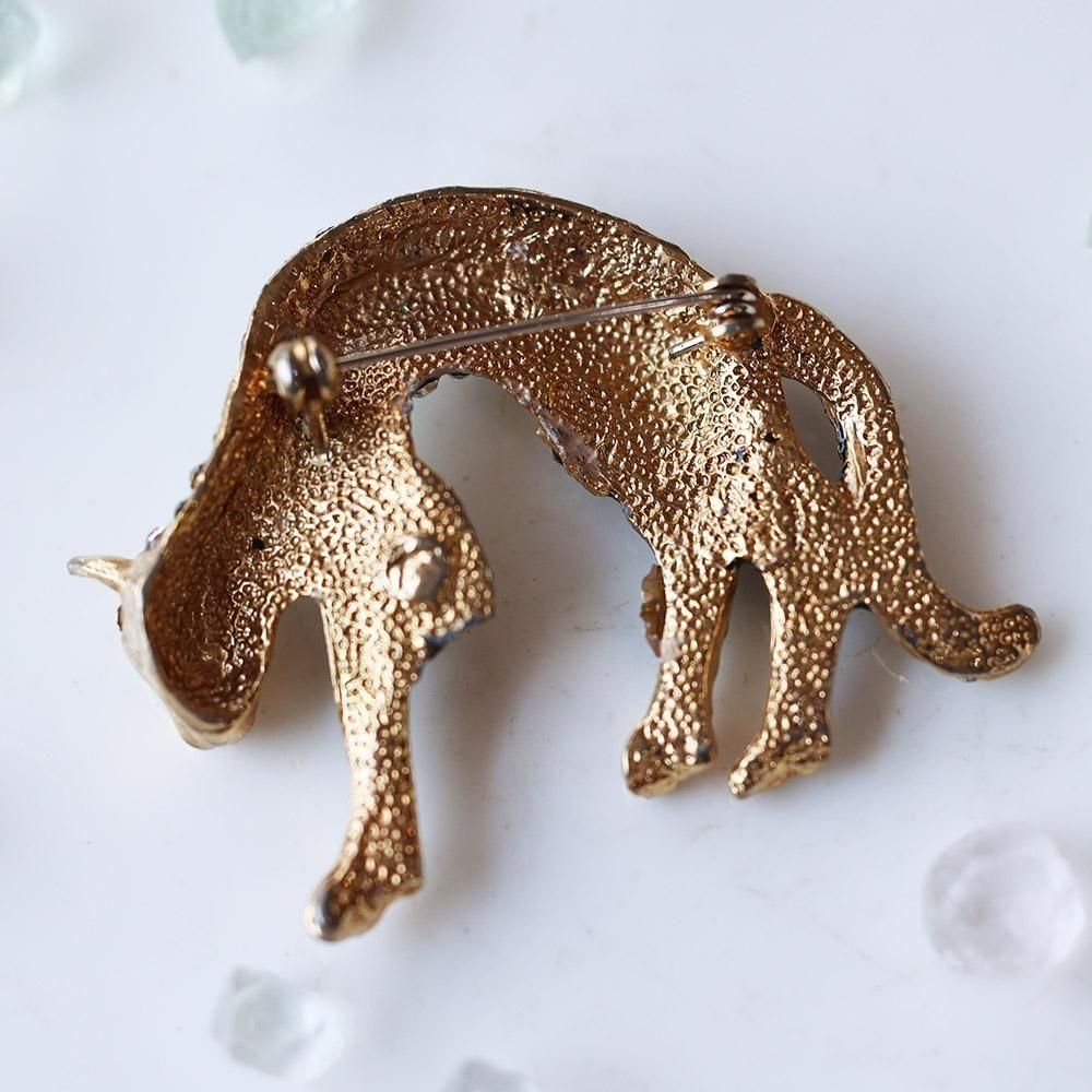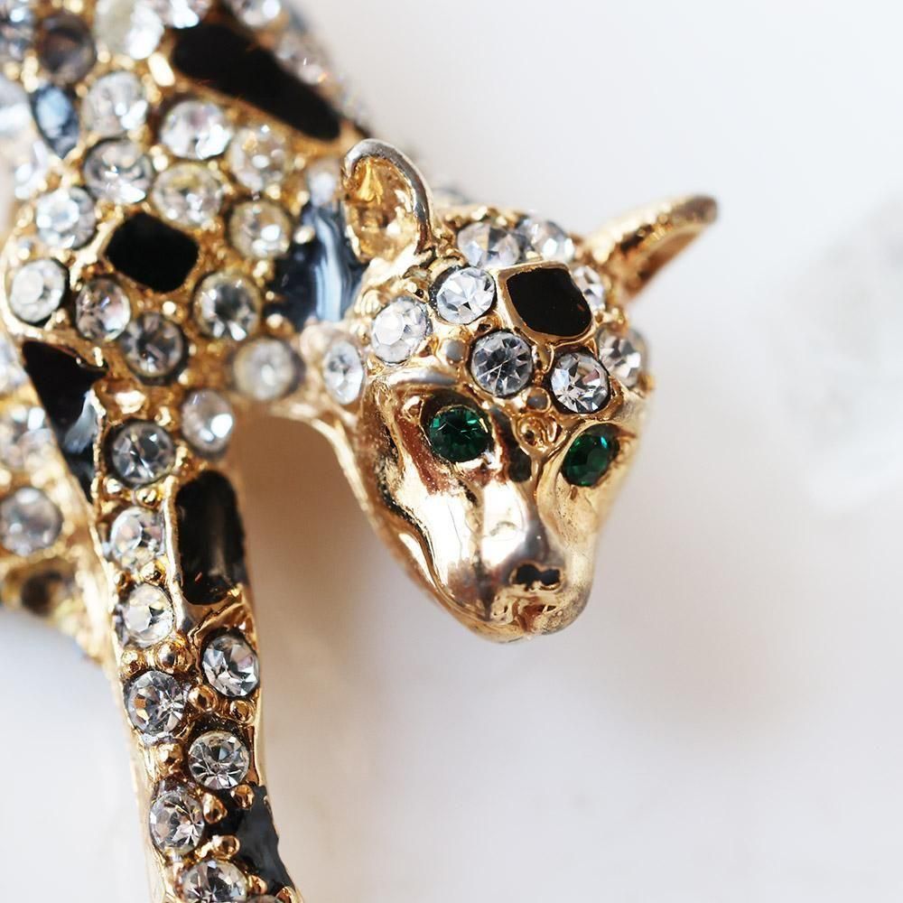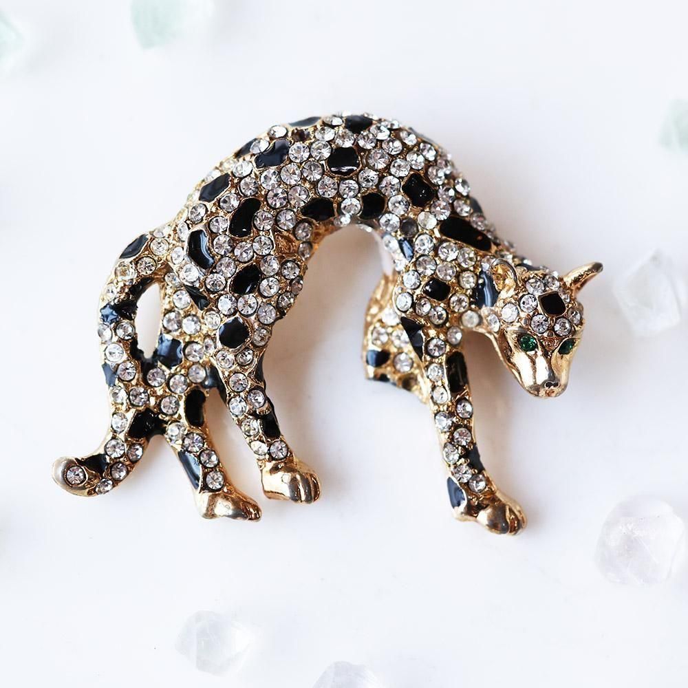 A metal brooch featuring a charming leopard design, adorned with scattered glass stones.