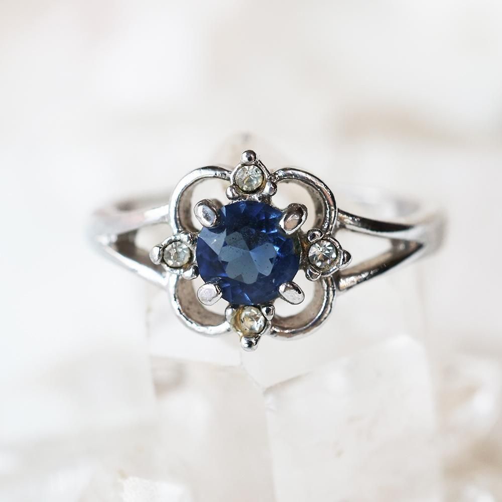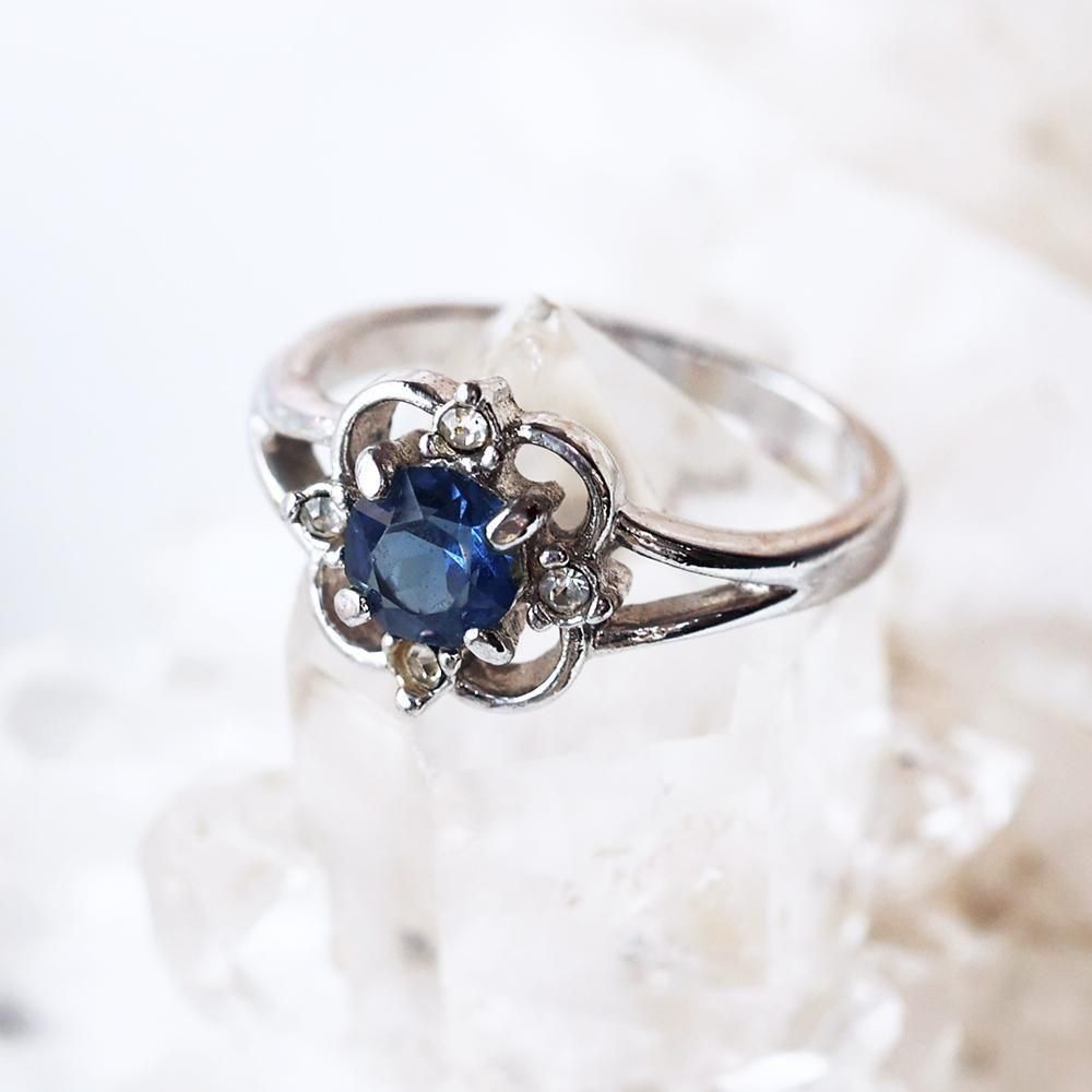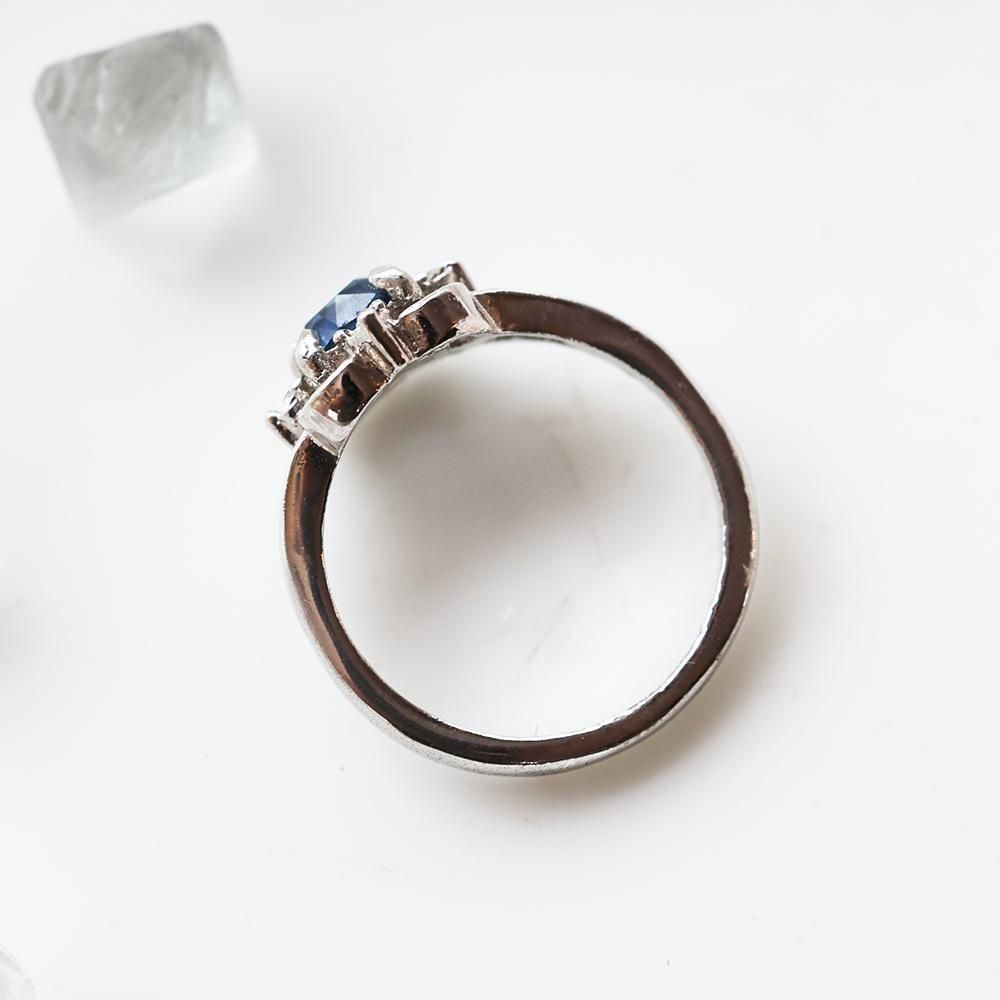 落ち着いたブルーの硝子(石の可能性もございます)が素敵な、古い指輪です。
